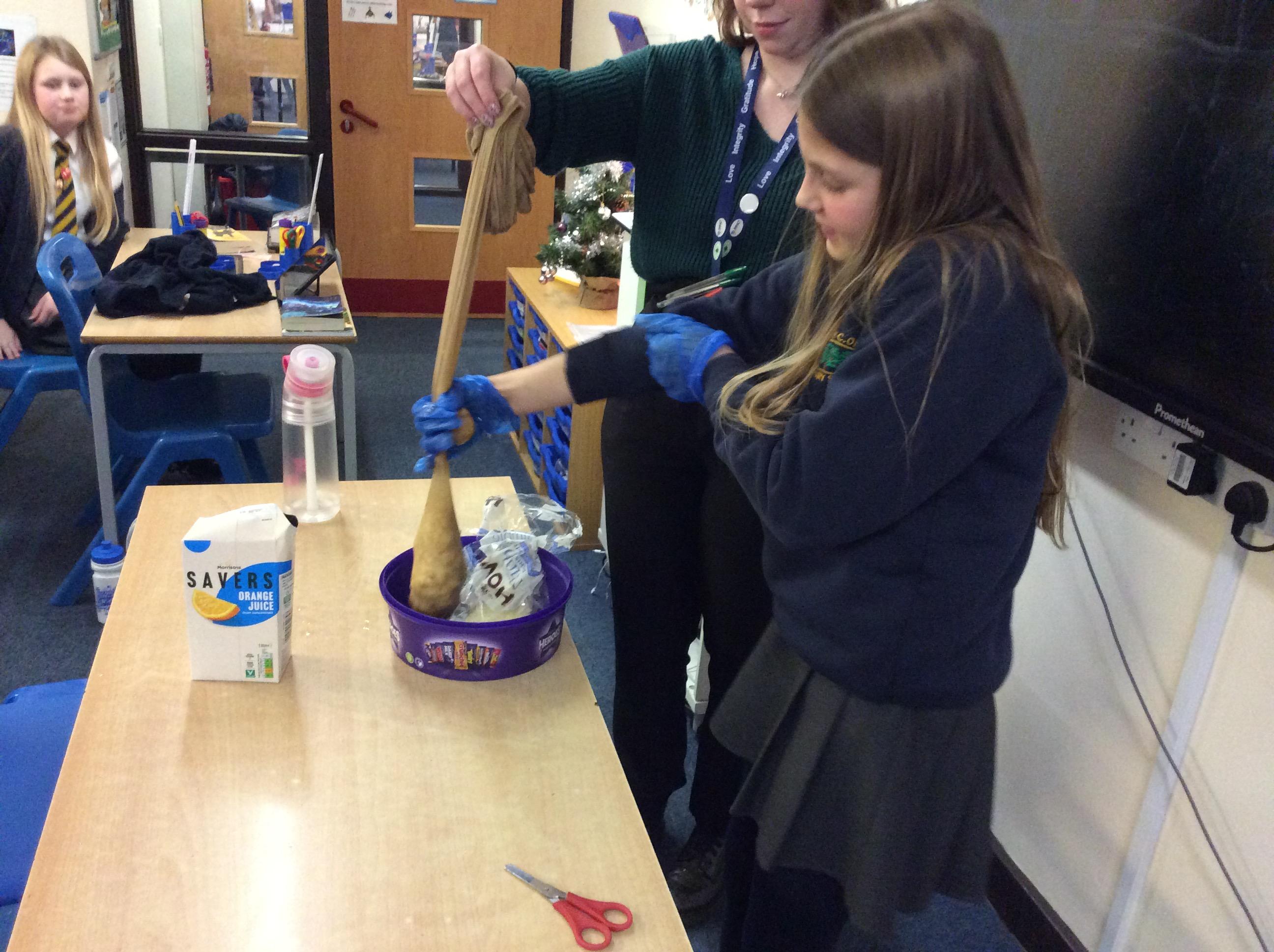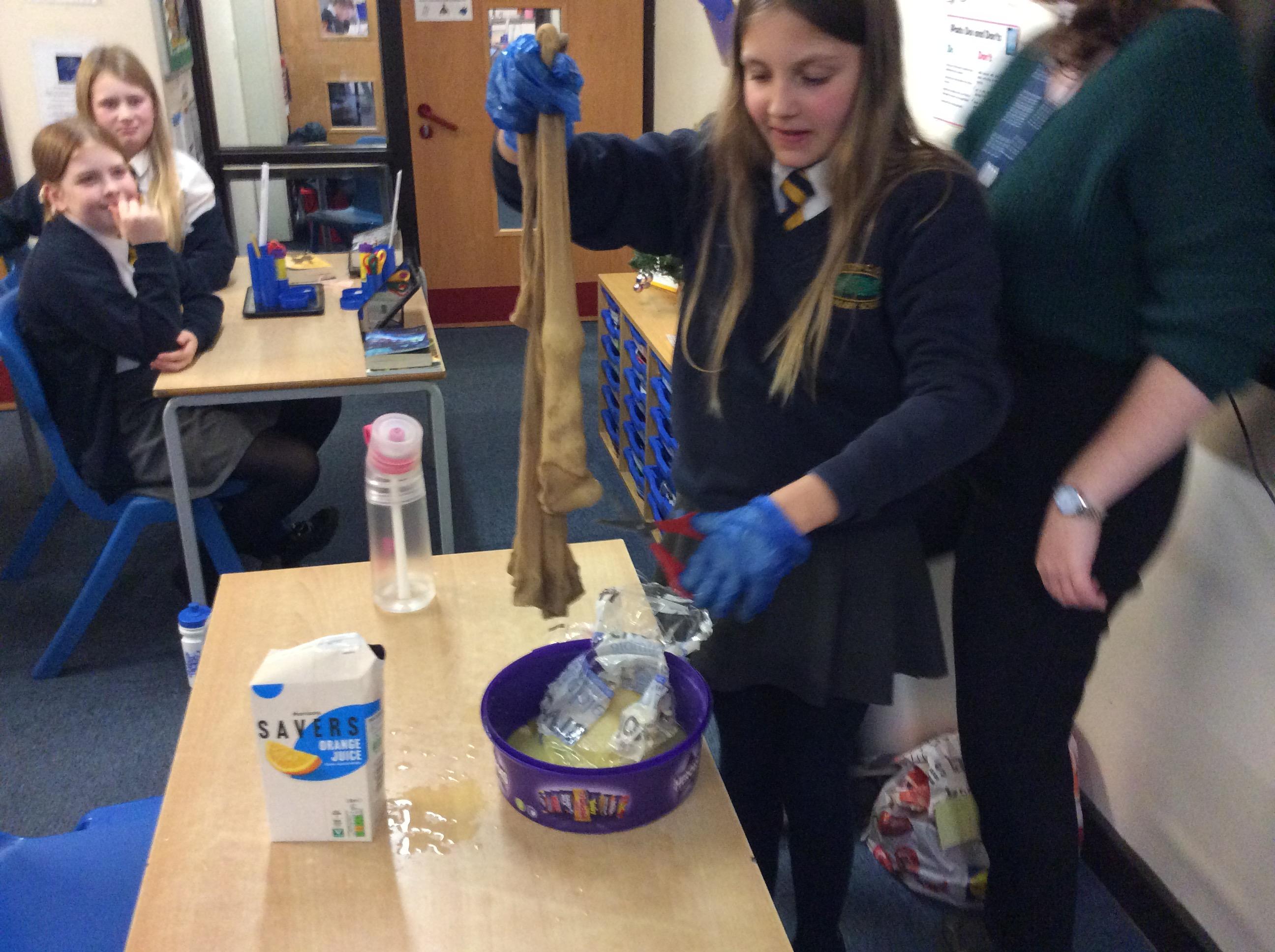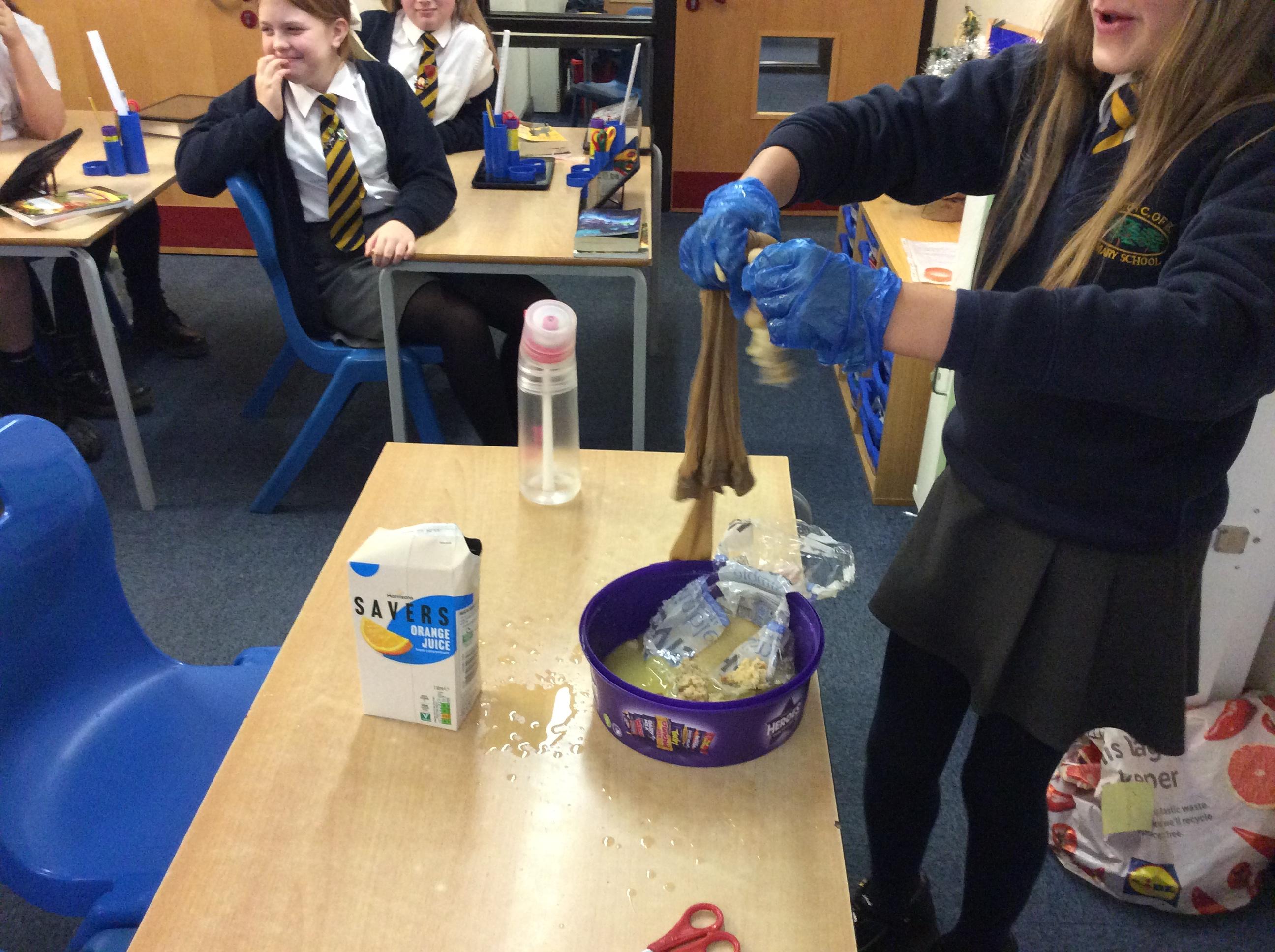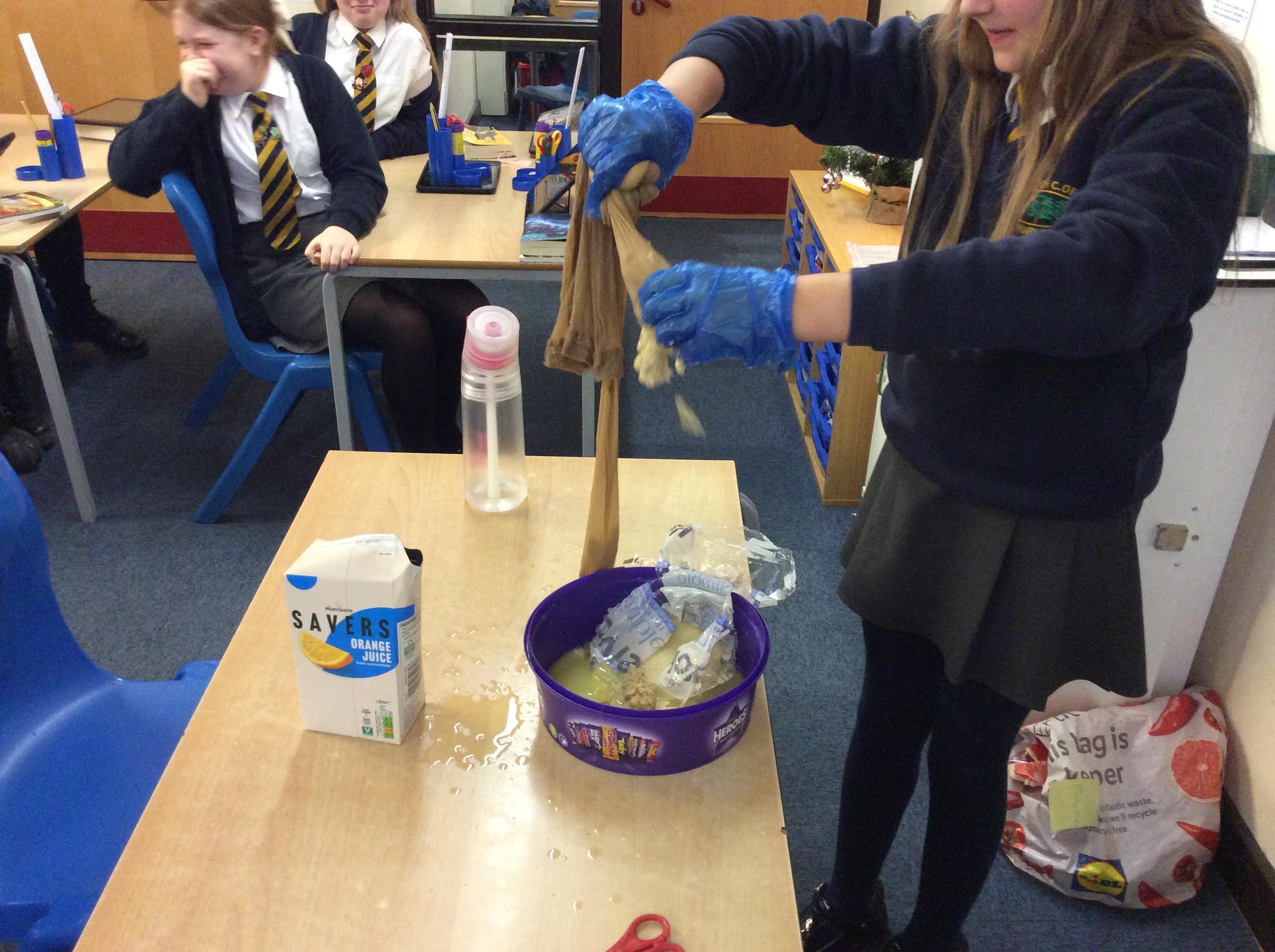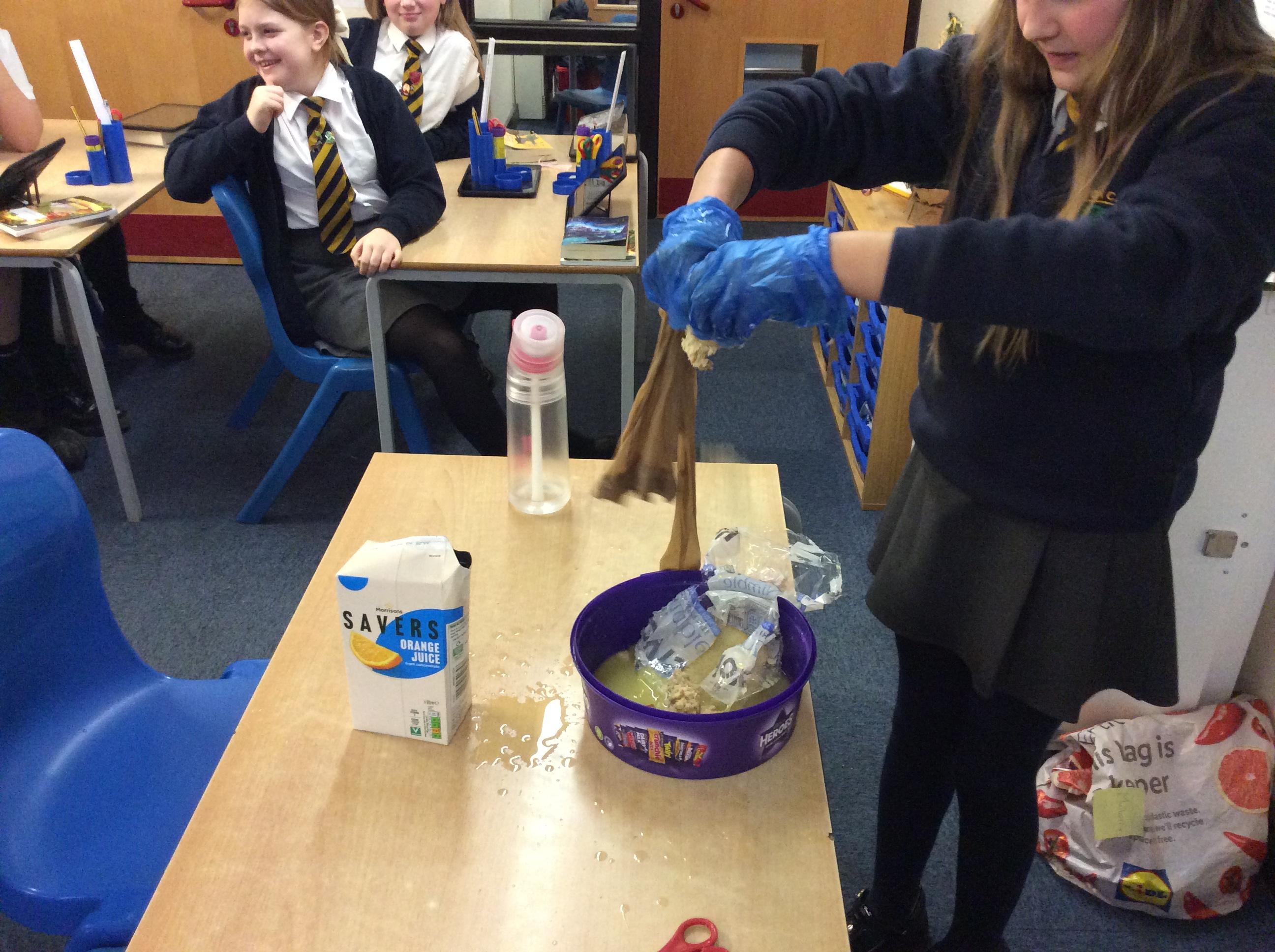As part of science, we have been learning about the digestive system. There were lots of people who felt very brave and volunteered to help recreate the process.
