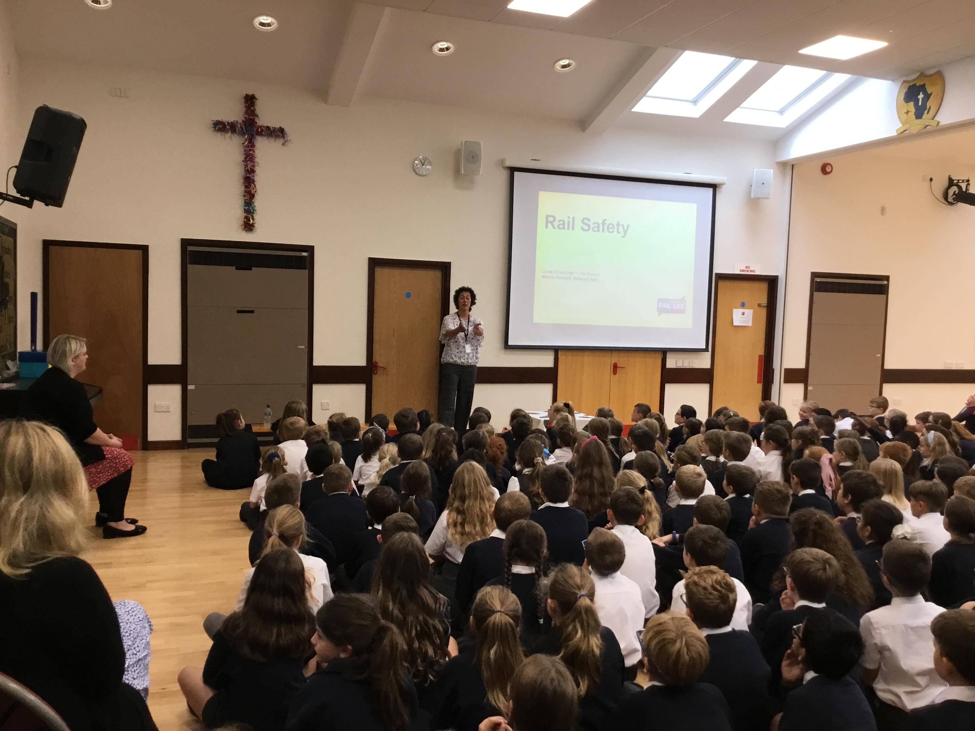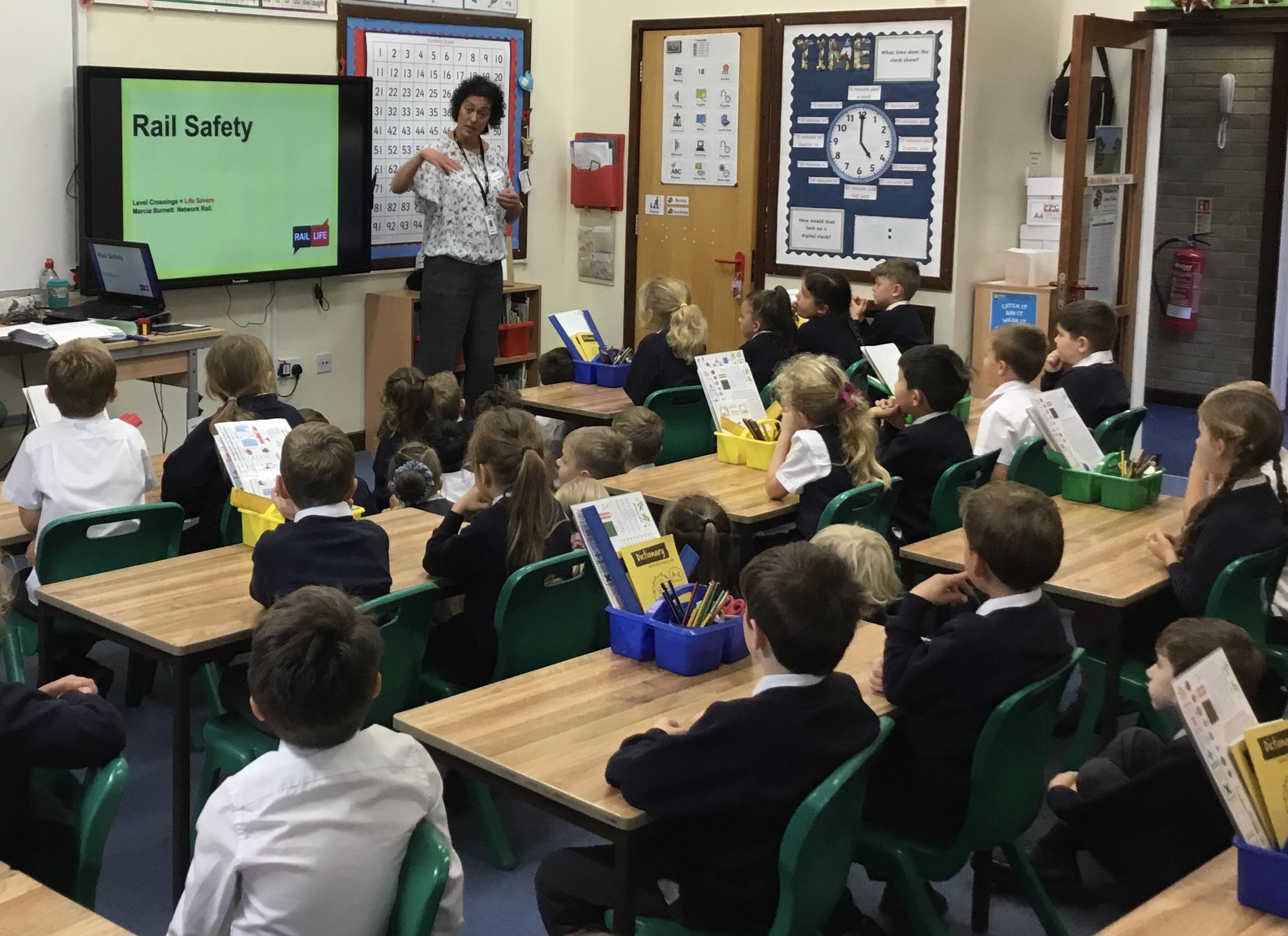 Marcia, from Network Rail, came to visit us today to teach us about how we can keep ourselves safe at train stations and level crossings. We learnt that a train can travel at up to 125mph and takes the length of 20 football pitches to stop. She taught us the rules about using level crossings and why we should keep behind the yellow lines at the stations.