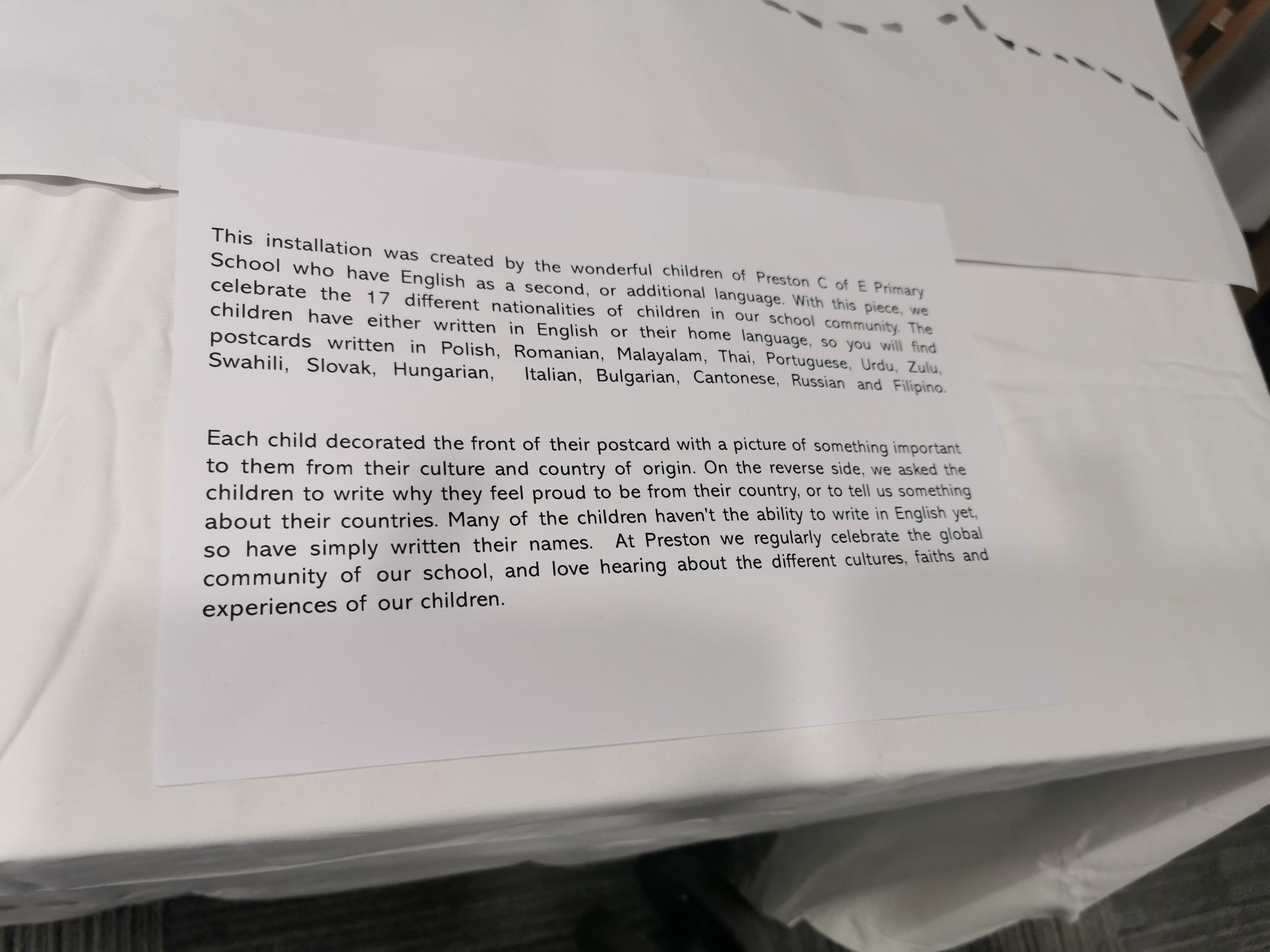 The children created their own individual postcards to explain something about their nationality; the postcards will to added to a chandelier style art installation to showcase all their different nationalities and what makes each of them so special.