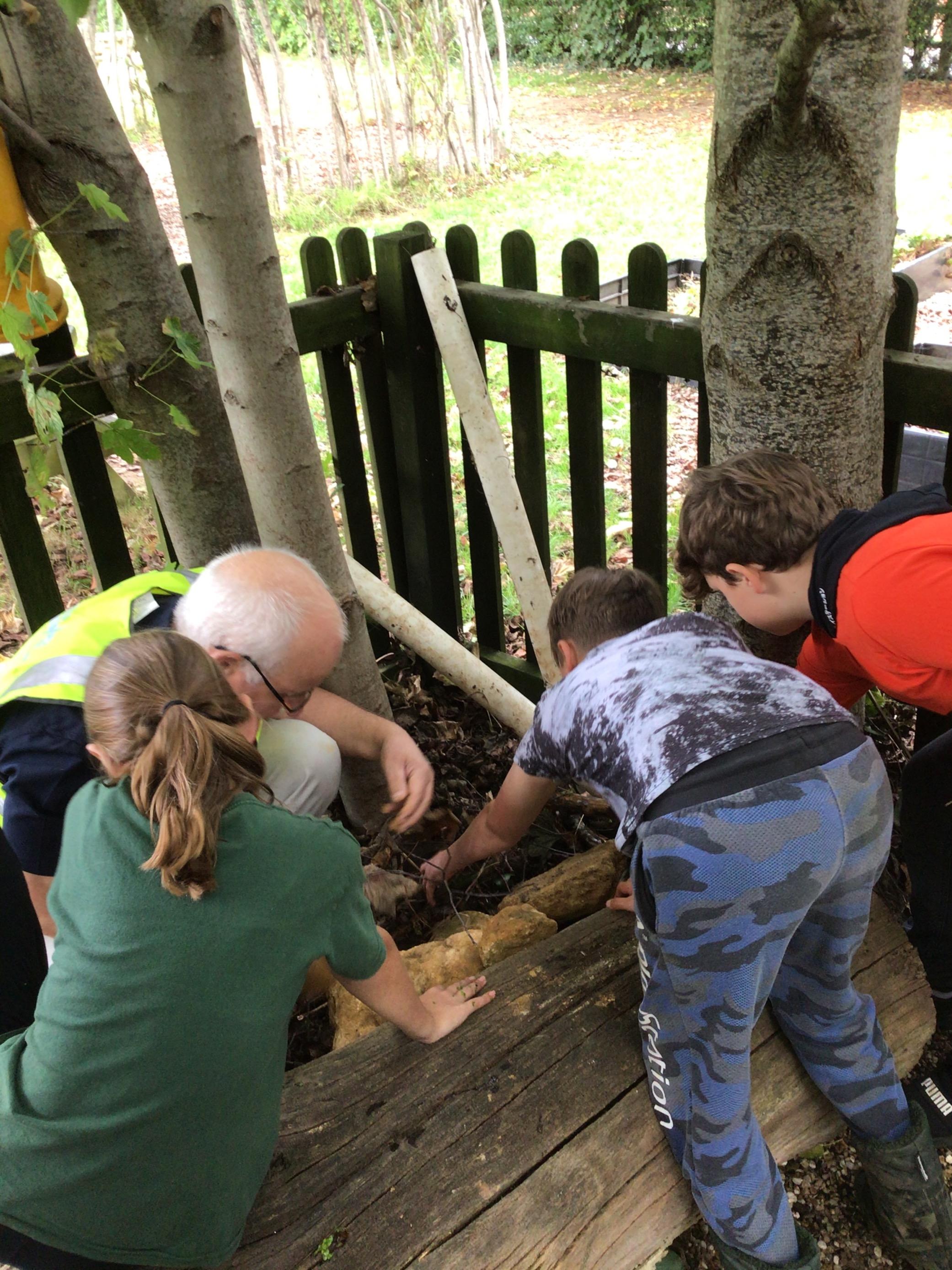 We planted a selection of native aquatic plants such as Marsh Marigold, Yellow Flag Iris and Water Plantain as they are excellent pollen sources and should also help release oxygen back into the pond. The children also used large pieces of ham stone to build ramps in the corner of the pond to provide safer access for wildlife. In the corner of our pond area, we constructed a hibernaculum from stone and branches that will help create a safe shelter for insects, reptiles and amphibians visiting the pond.