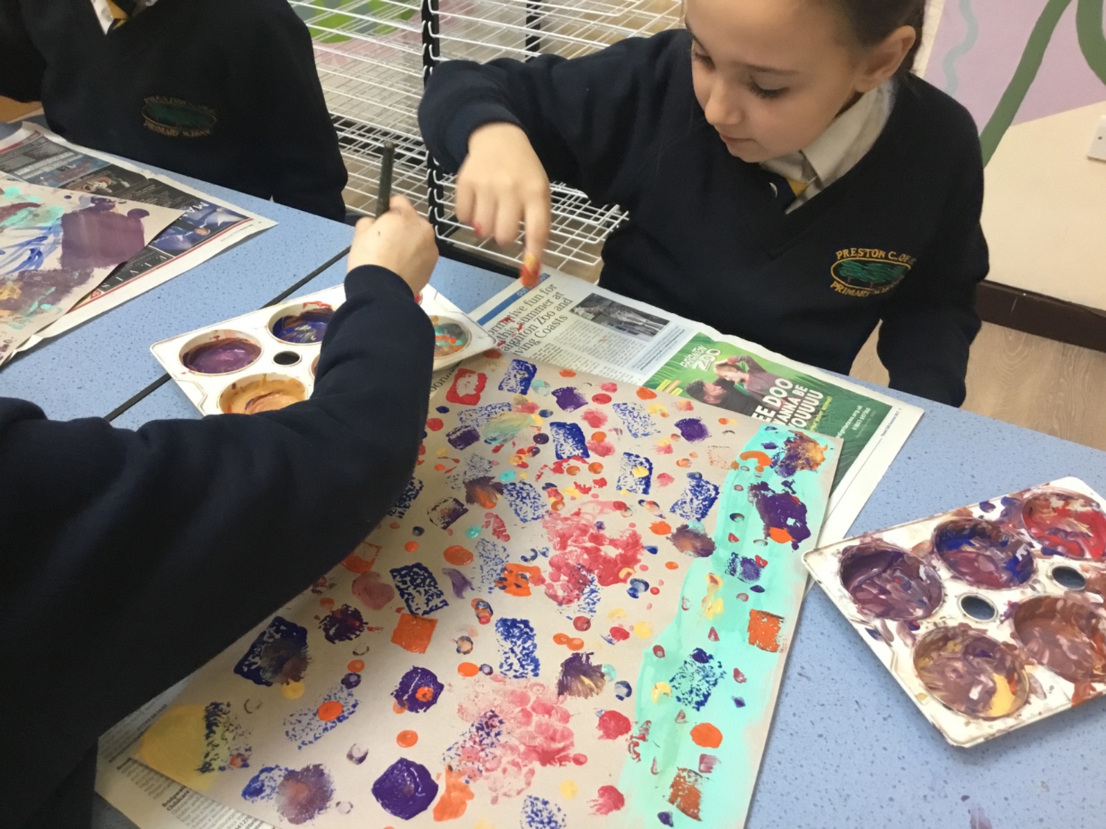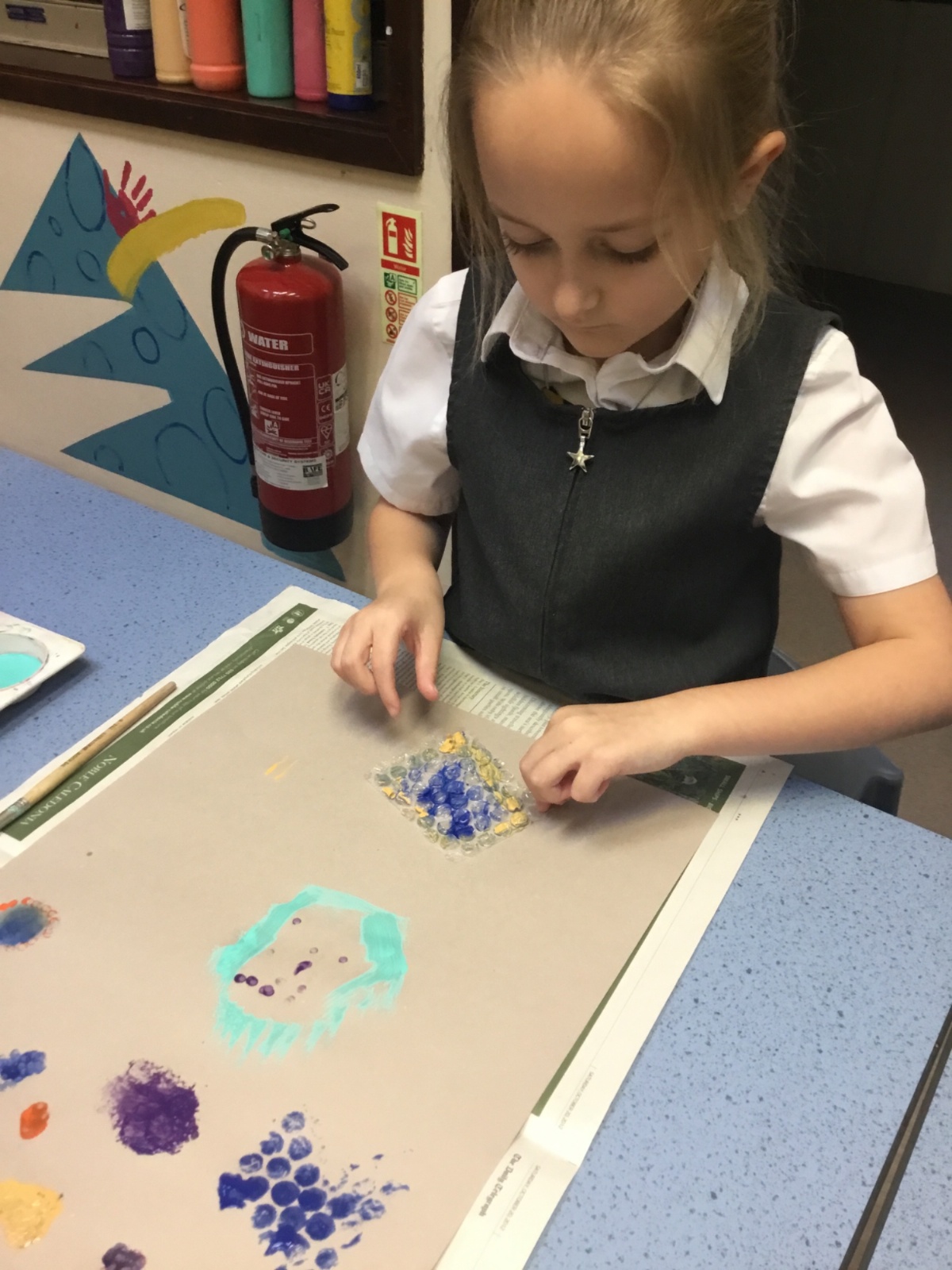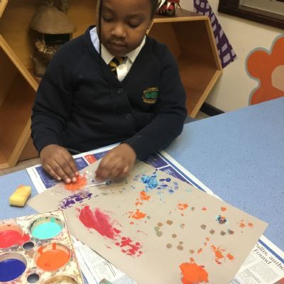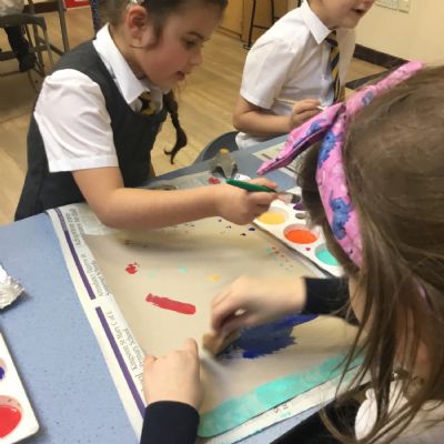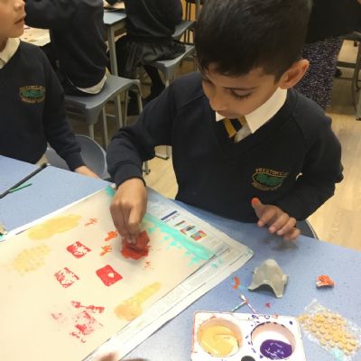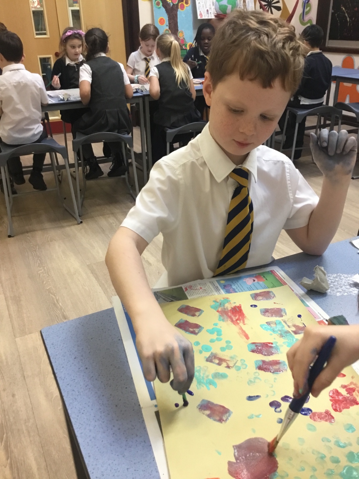 After our texture hunt last week, we have used different tools to create textures with paint. It was messy, but we had fun!