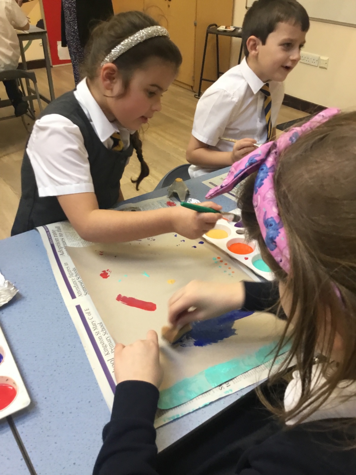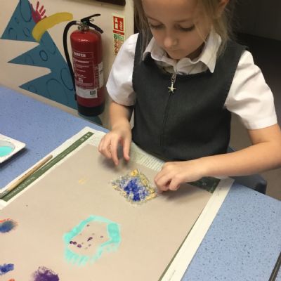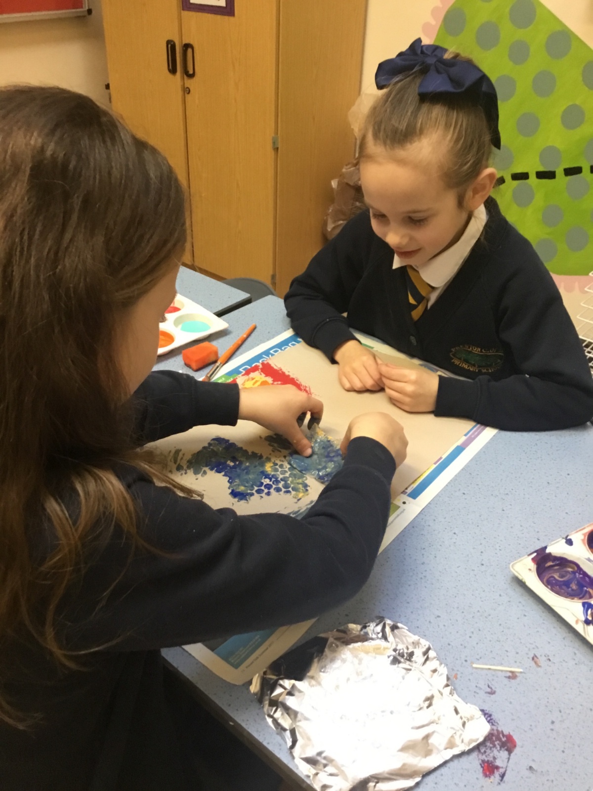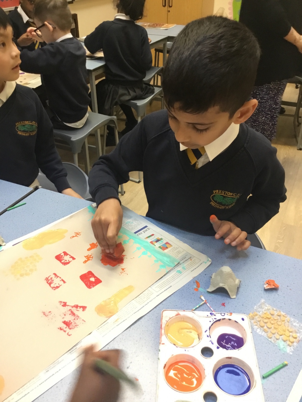 After our texture hunt last week, we have used different tools to create textures with paint. It was messy, but we had fun!