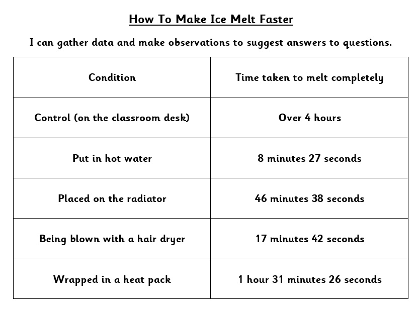 We planned and carried out a fair test to find out how to make ice melt faster. Once we had our results, we made conclusions based on our observations.
