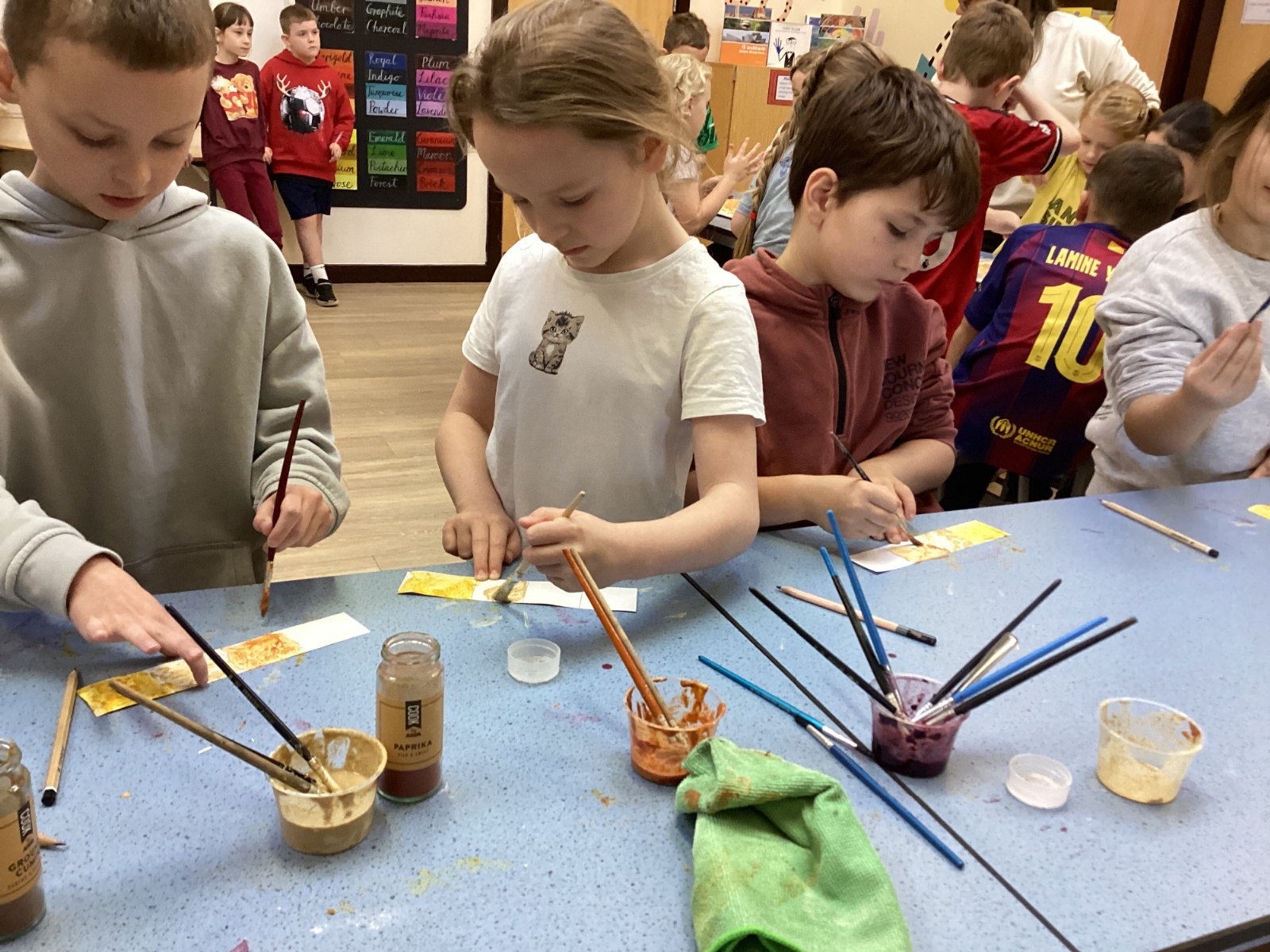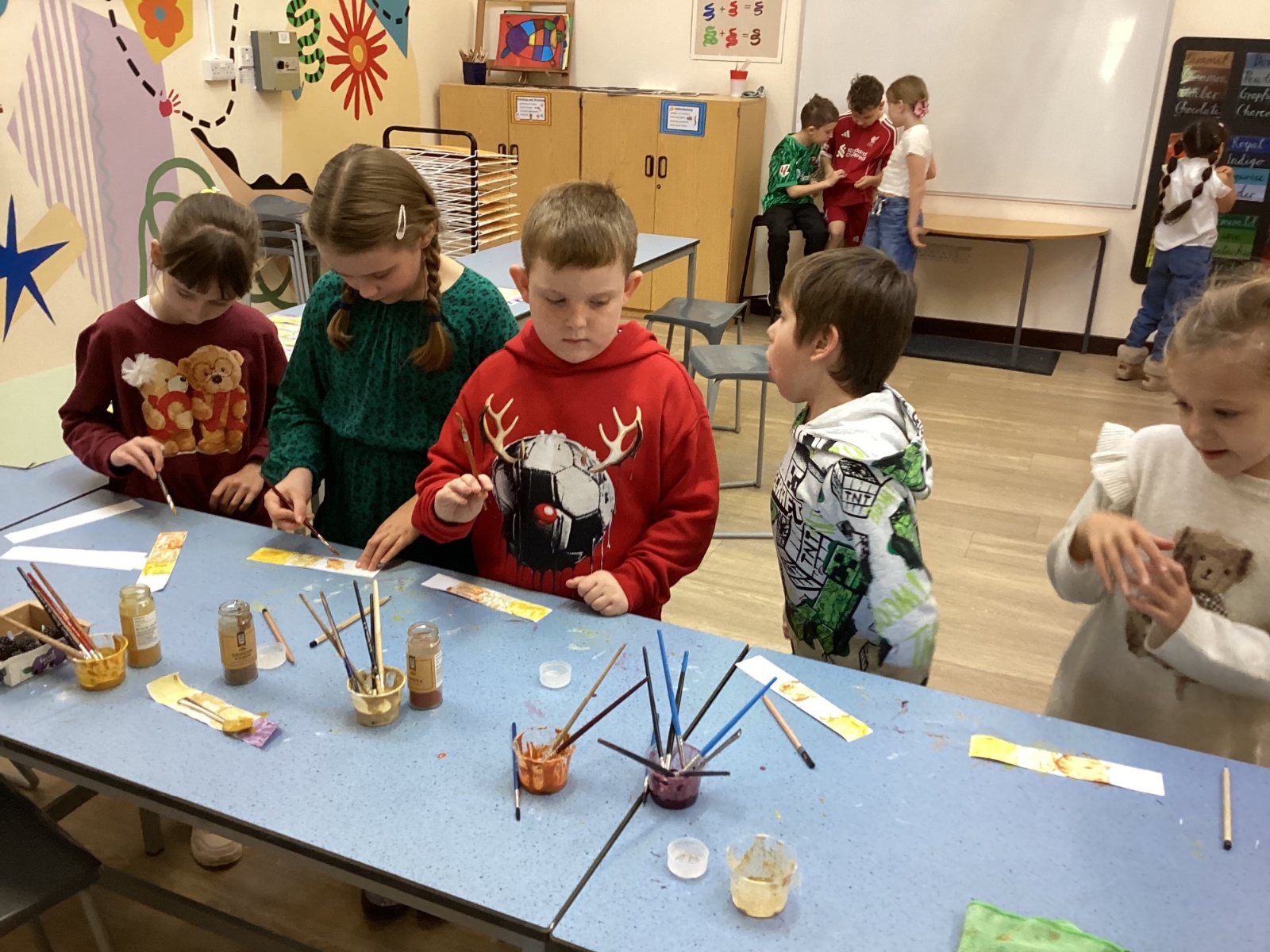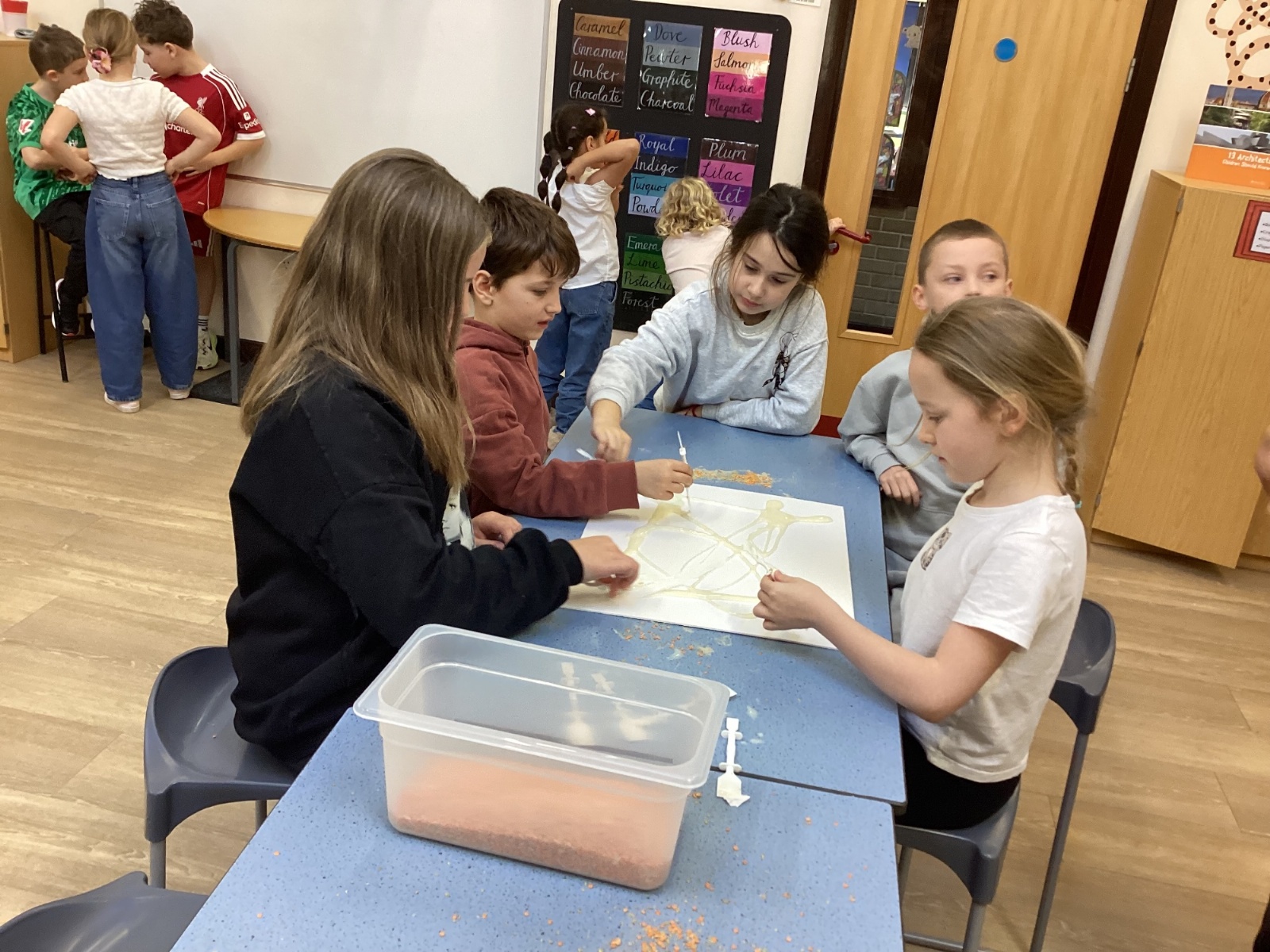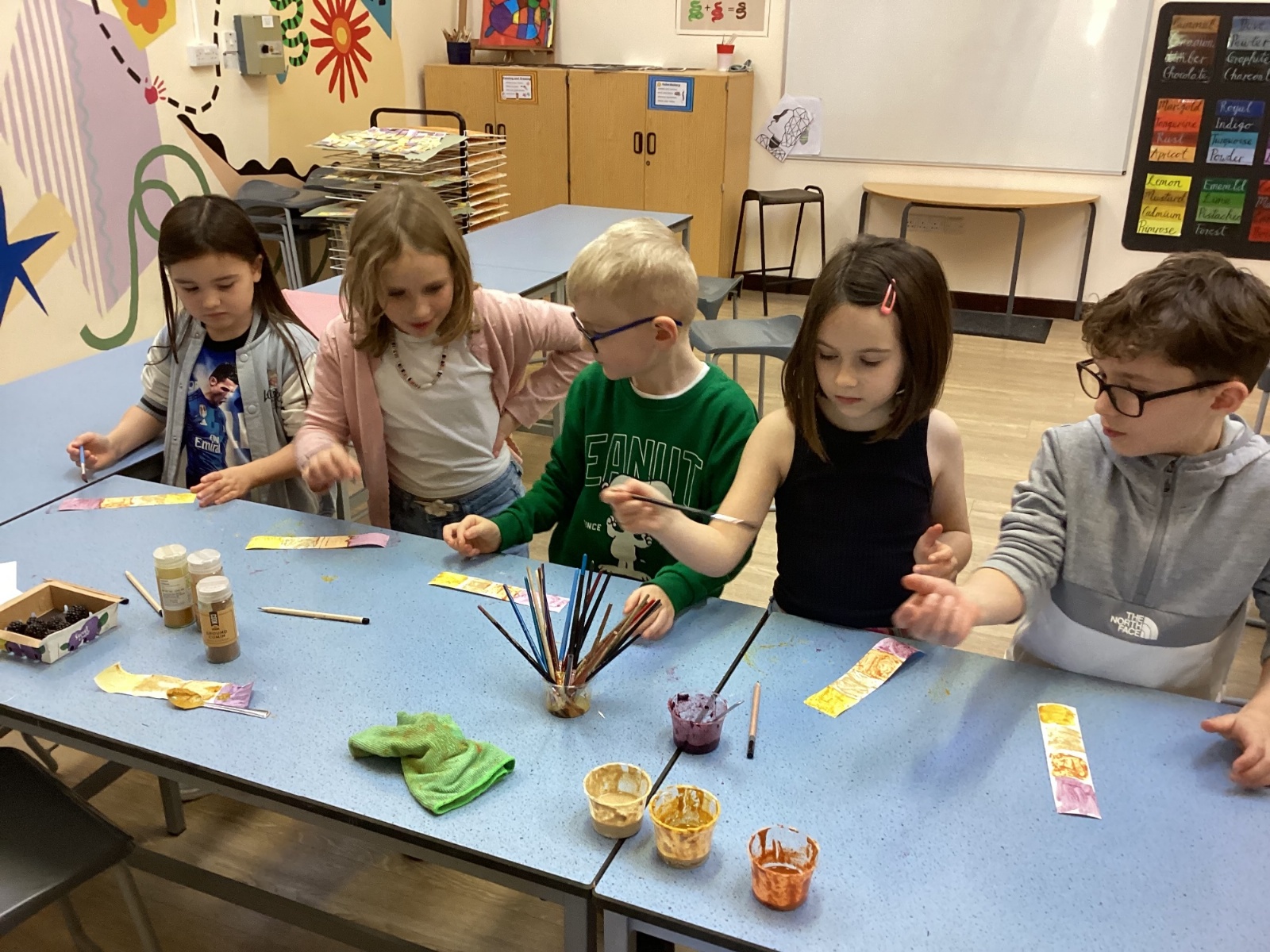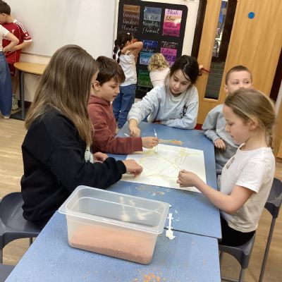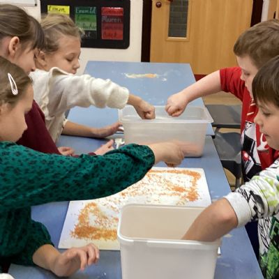We used spices such as paprika, turmeric and cumin and blackberries to make our own paint. We then used lentils, rice and sand to create a textured cave wall background ready for drawing on.