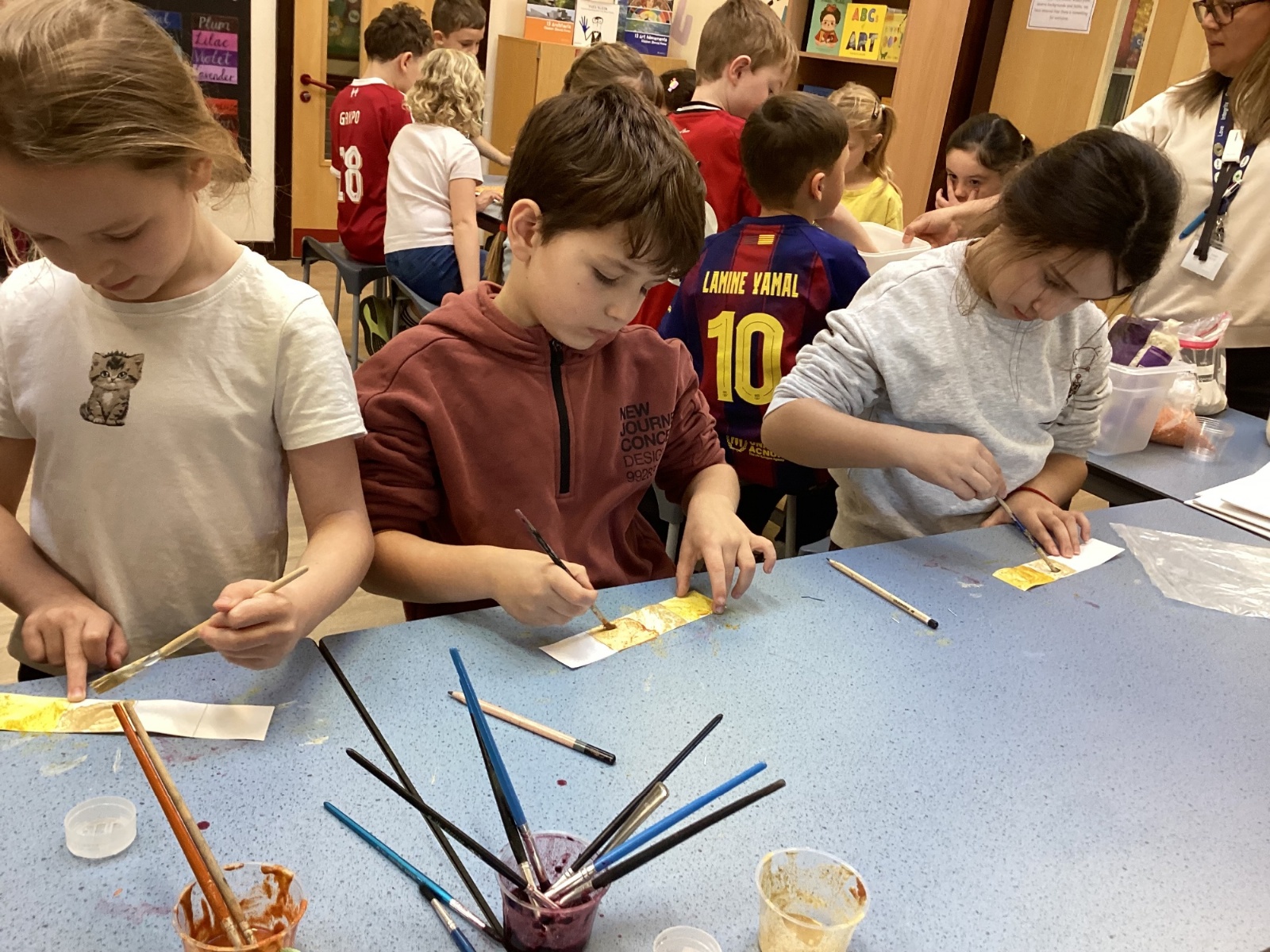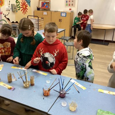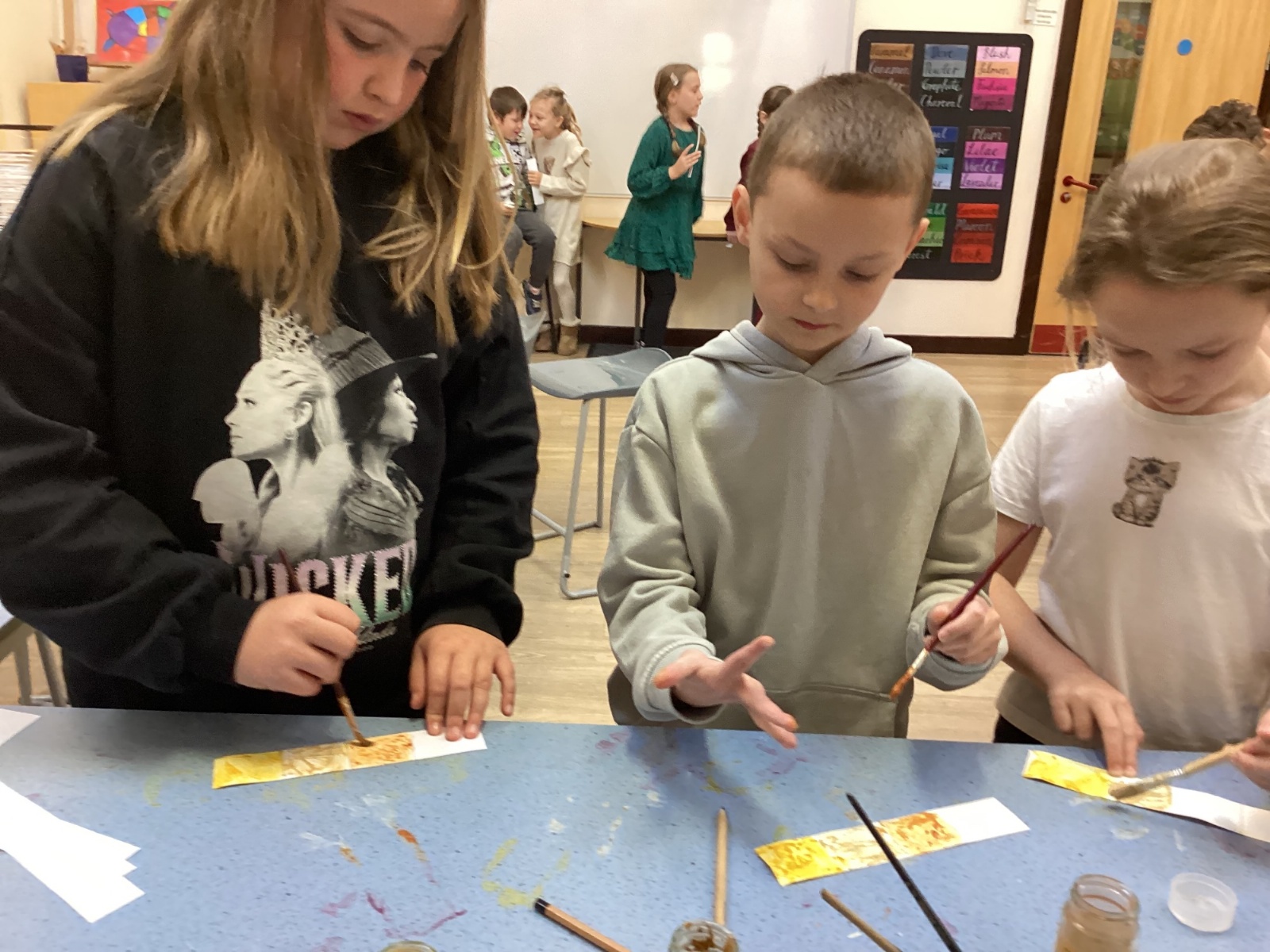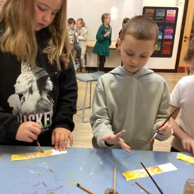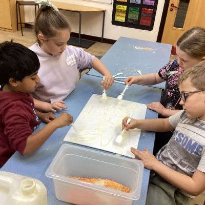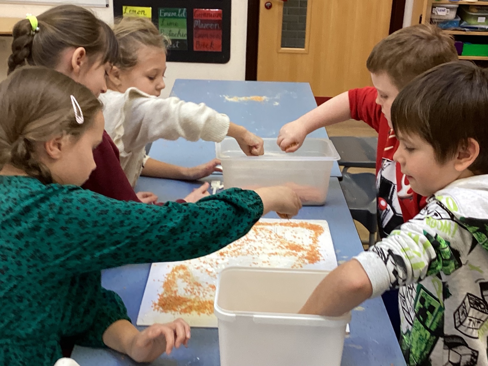 We used spices such as paprika, turmeric and cumin and blackberries to make our own paint. We then used lentils, rice and sand to create a textured cave wall background ready for drawing on.