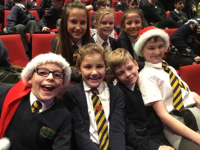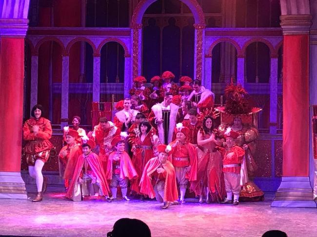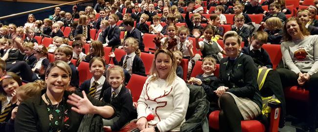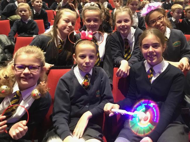 Staff and pupils enjoying the Panto—Snow White & The Seven Dwarfs.