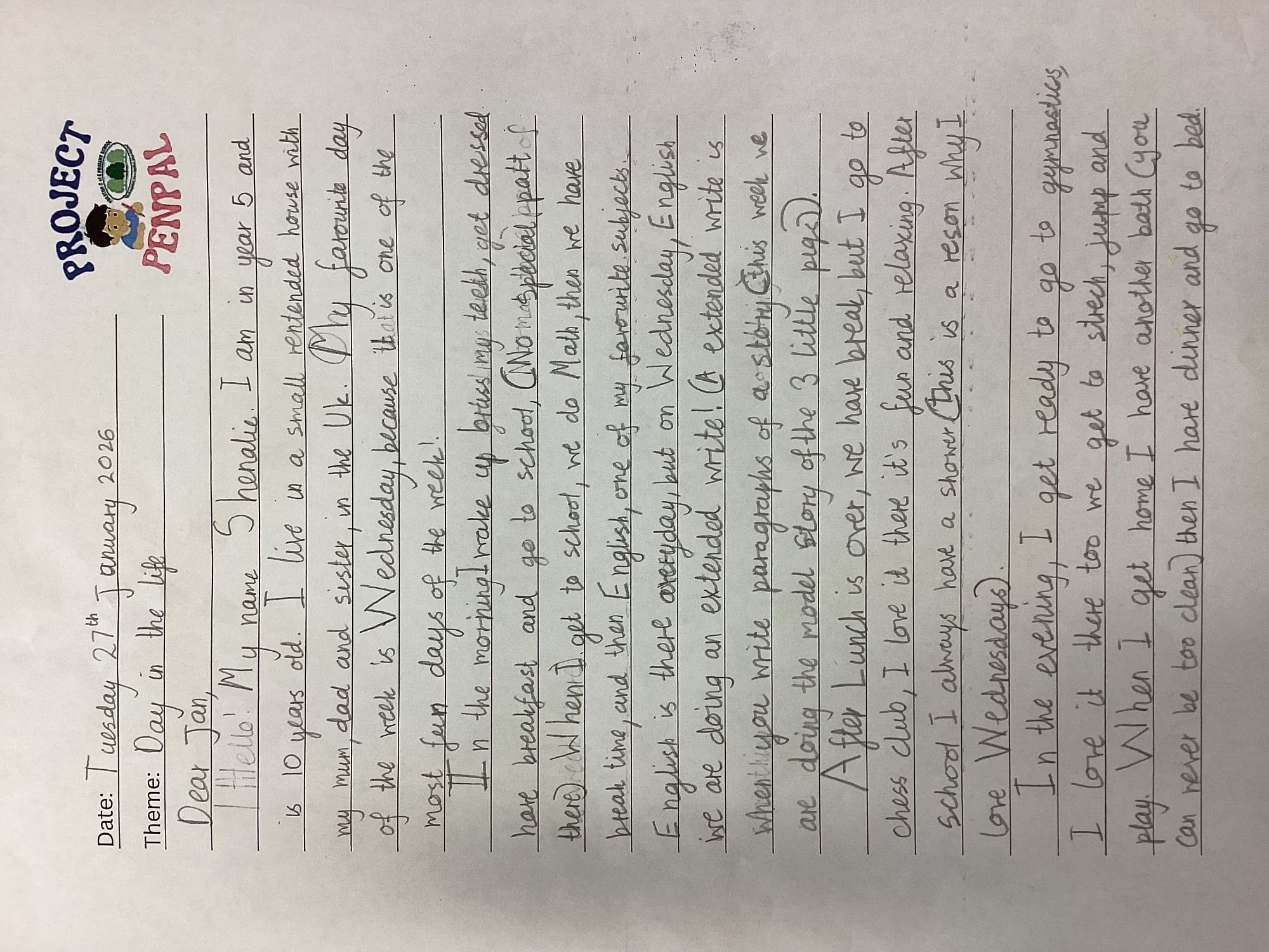 Our first letter writing session was a success! The children introduced themselves and described their favourite day of the week. This will open up discussions about hobbies, breakfast choices, why they chose that day and much more! We will receive the replies to our letters before our next session at the end of February. We had 42 children participate, which was amazing to see.