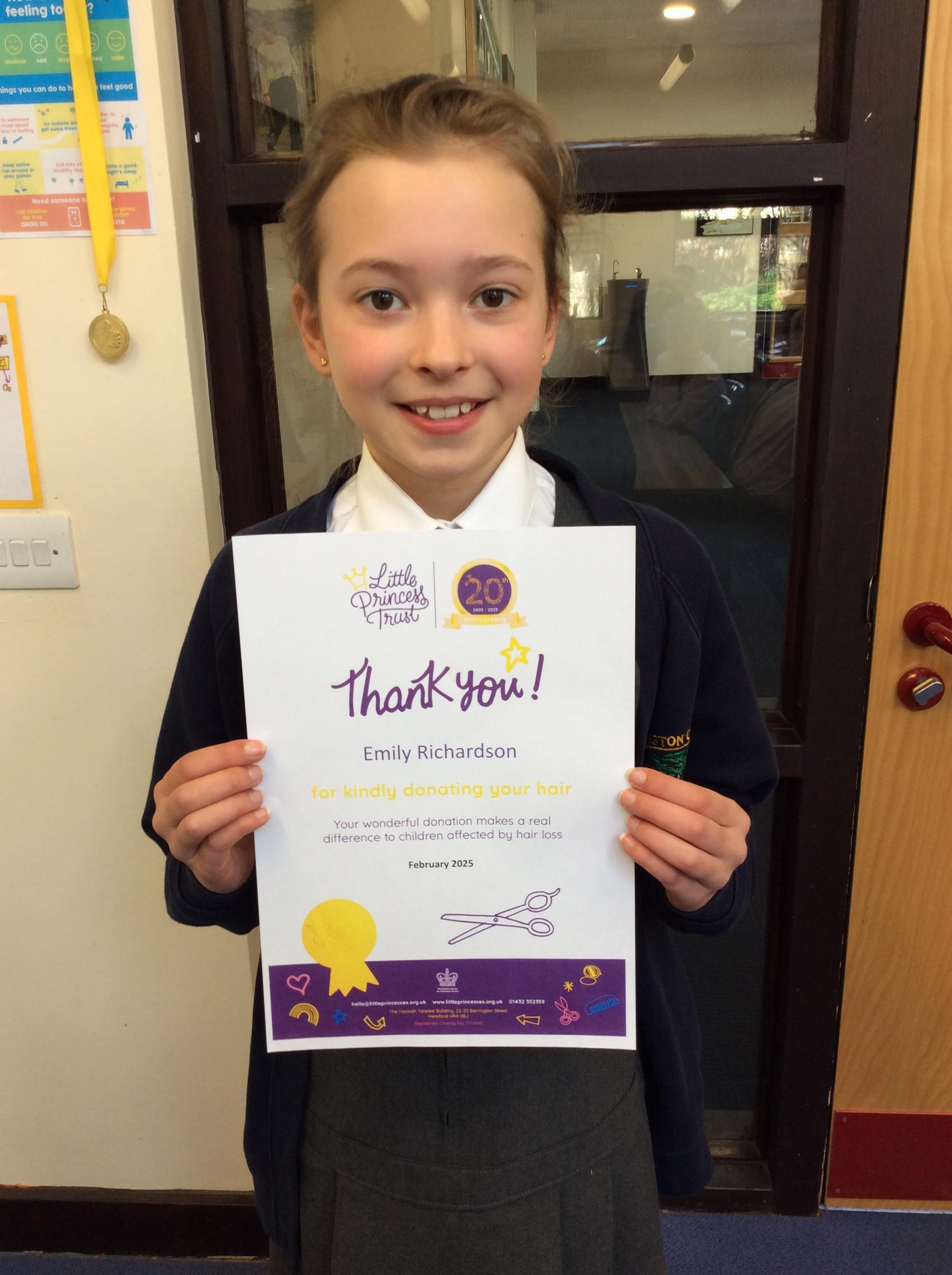 Emily, who is in Hornbeam class, recently made a heartfelt donation to the Little Princess Trust, raising an incredible £310 to support children experiencing hair loss. With her long, beautiful hair, Emily selflessly decided to have it cut and donated it to help create wigs for young people in need. Her kindness and generosity have not only made a huge difference in the lives of others but have also inspired our school community.