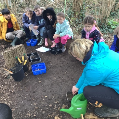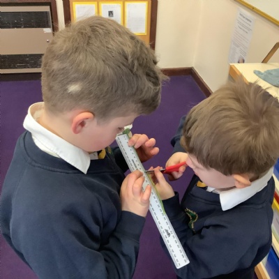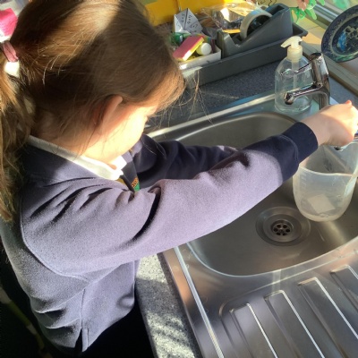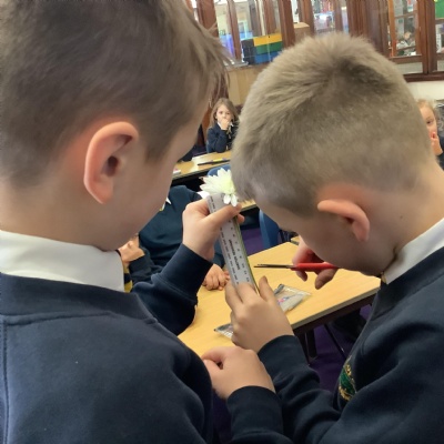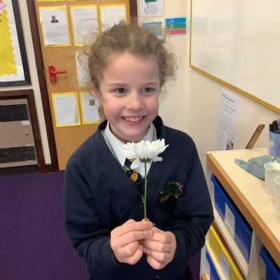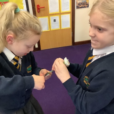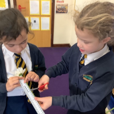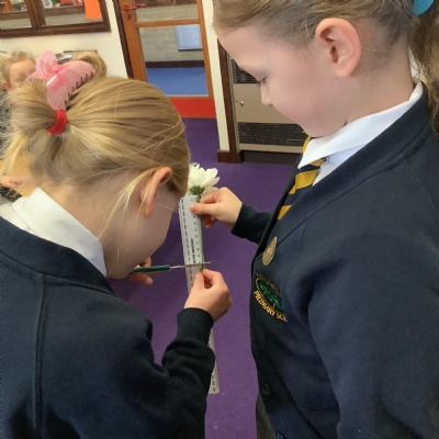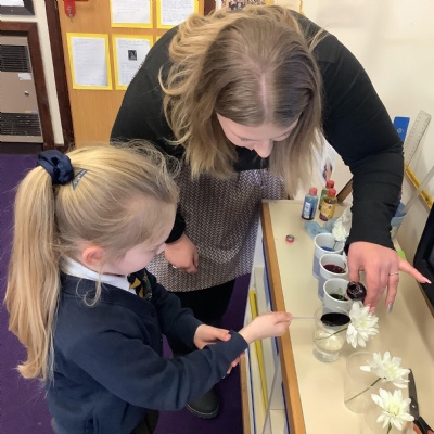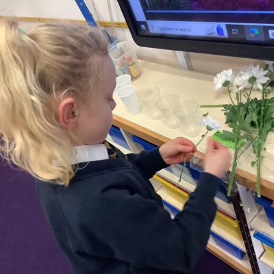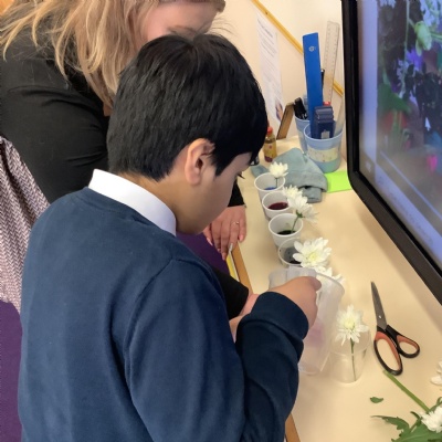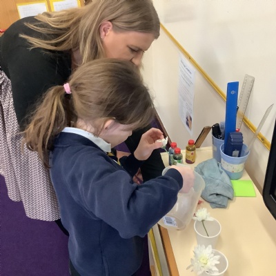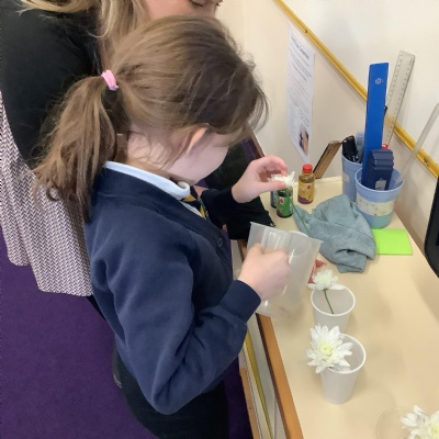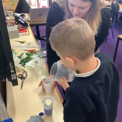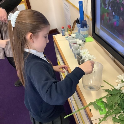 Today, we conducted an experiment to investigate how water is transported within plants. First, we cut the stems of the flowers to make sure they were all the same length and we measured out the water to ensure it was a fair test. We poured an equal amount of food colouring into each cup of water so that we are able to observe the water moving through the plant.