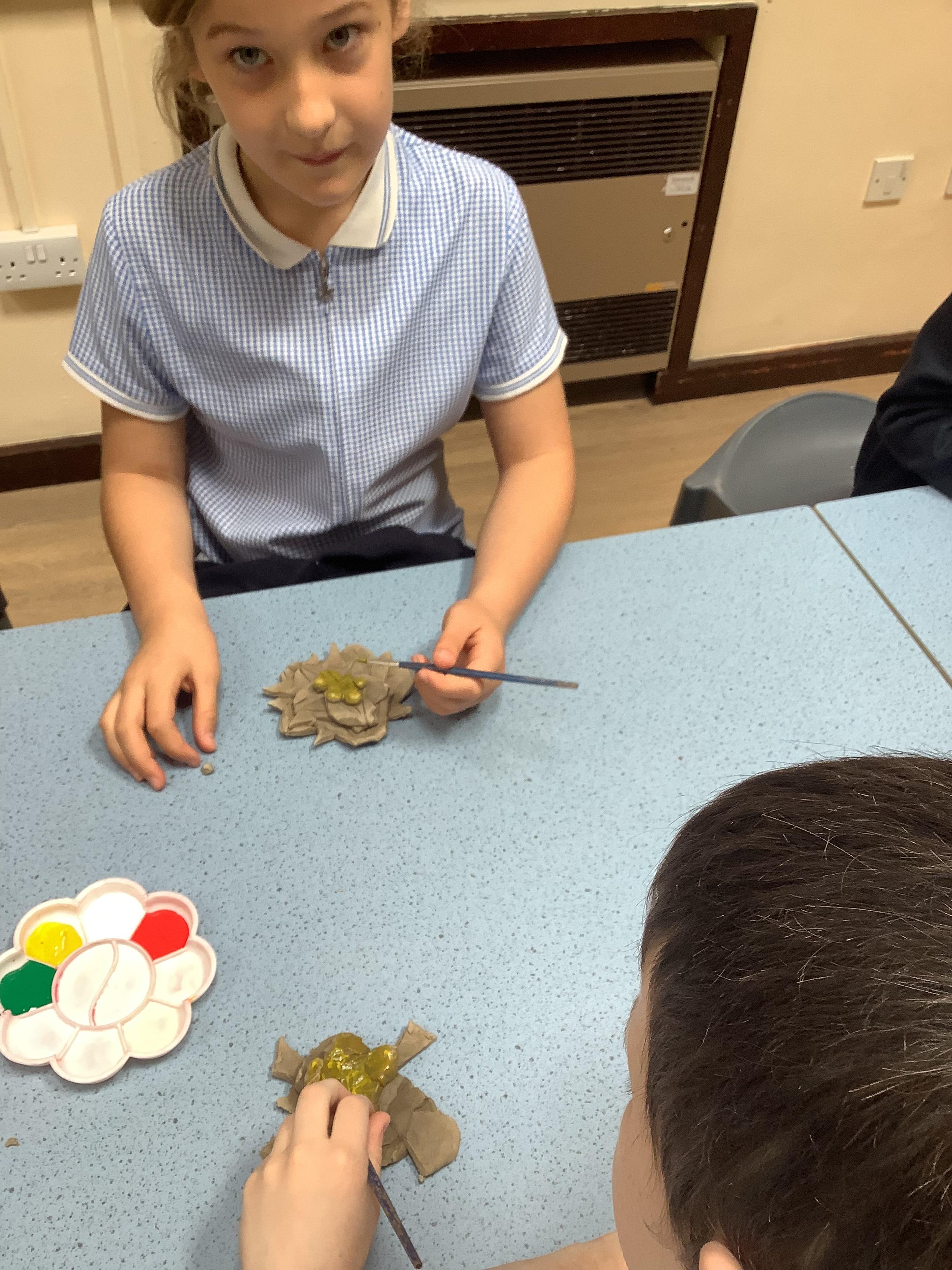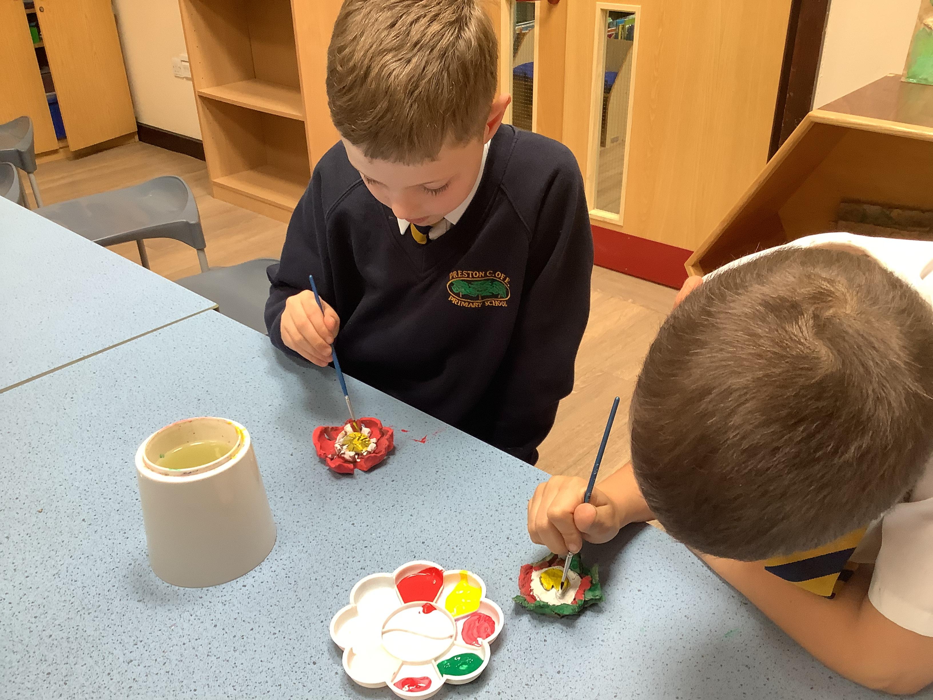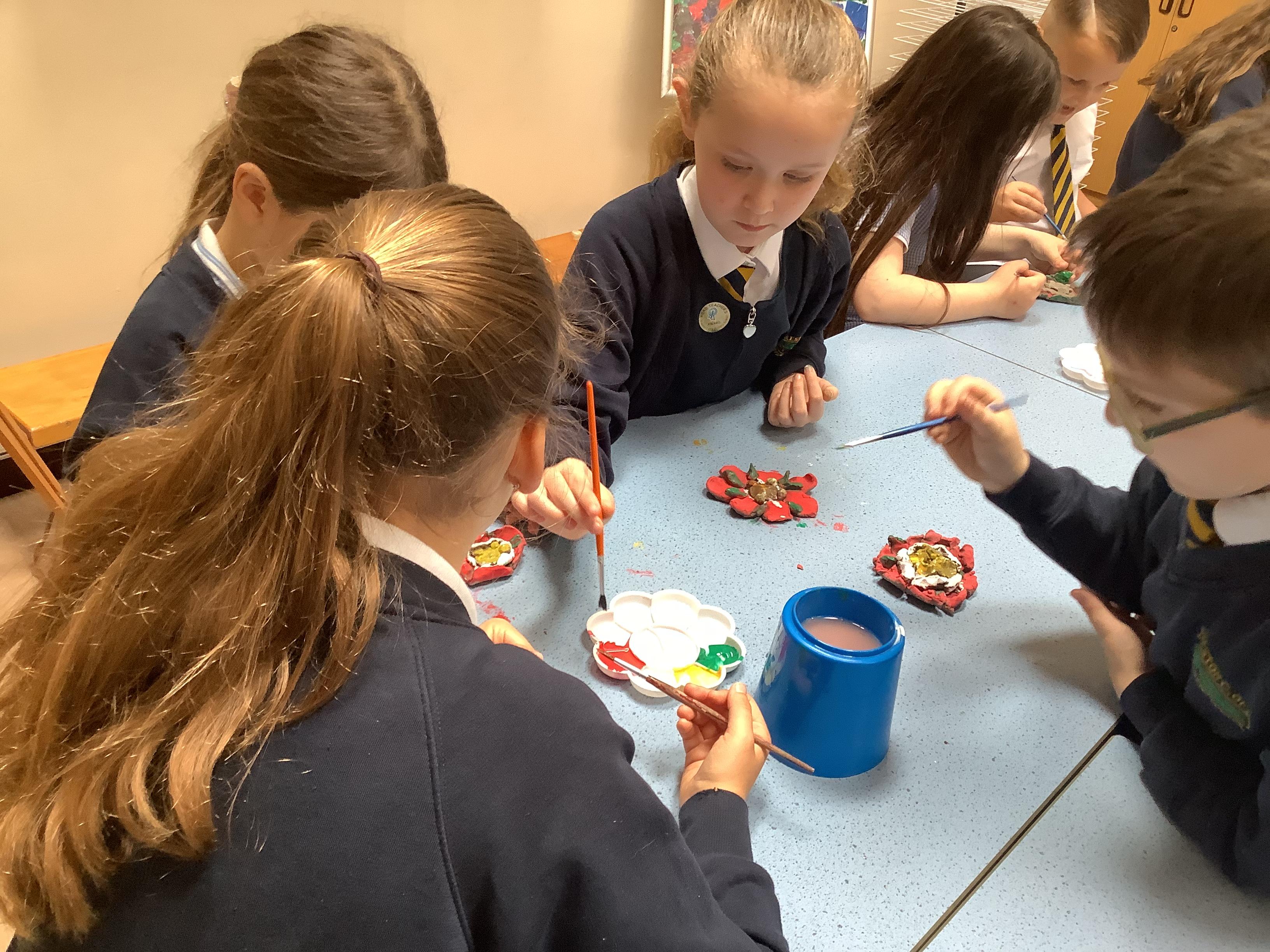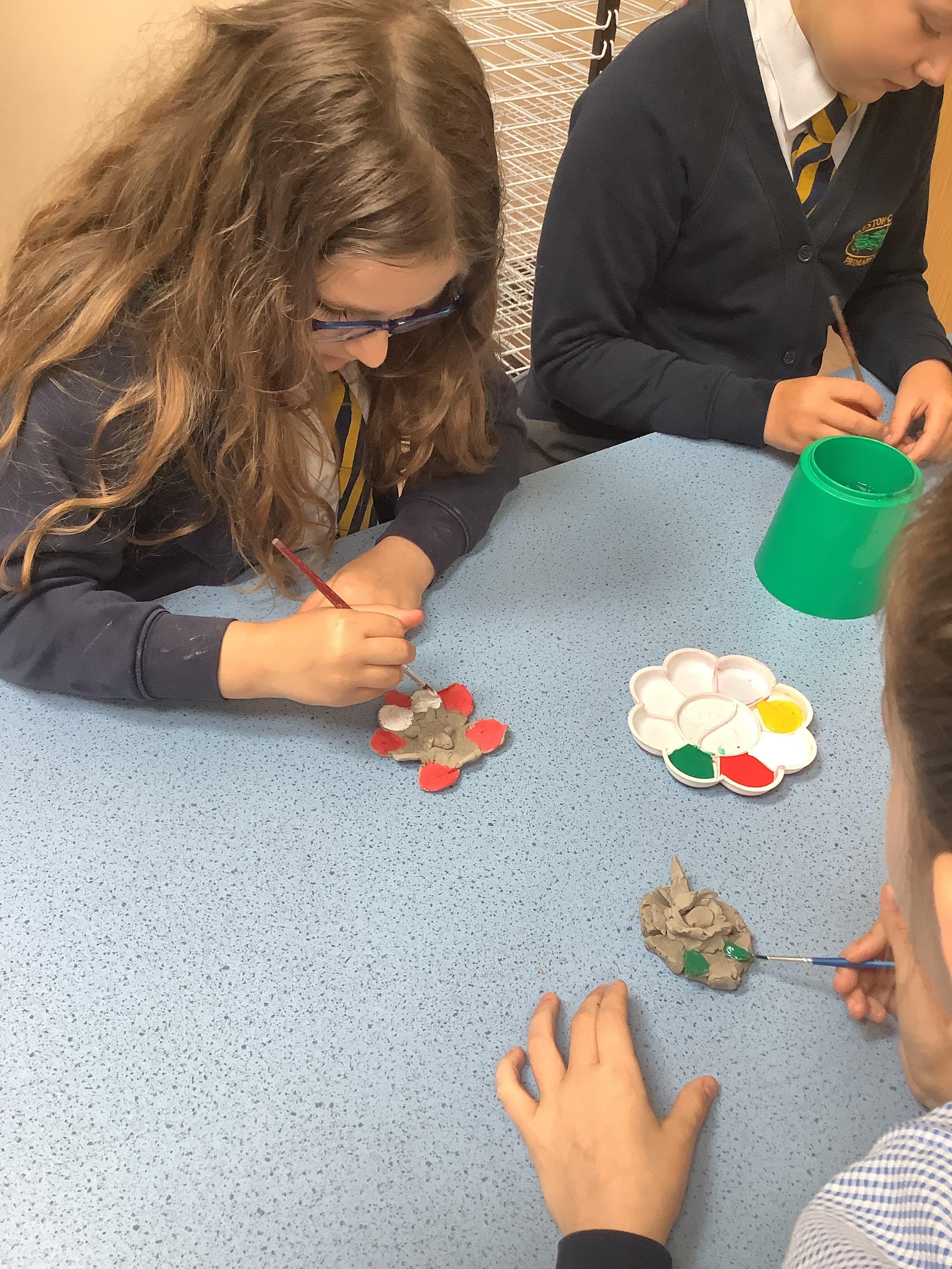Today we painted our Tudor roses from Wednesdays Tudor day. They had finally dried so we could add the paint to them. I think you’ll agree they look amazing!