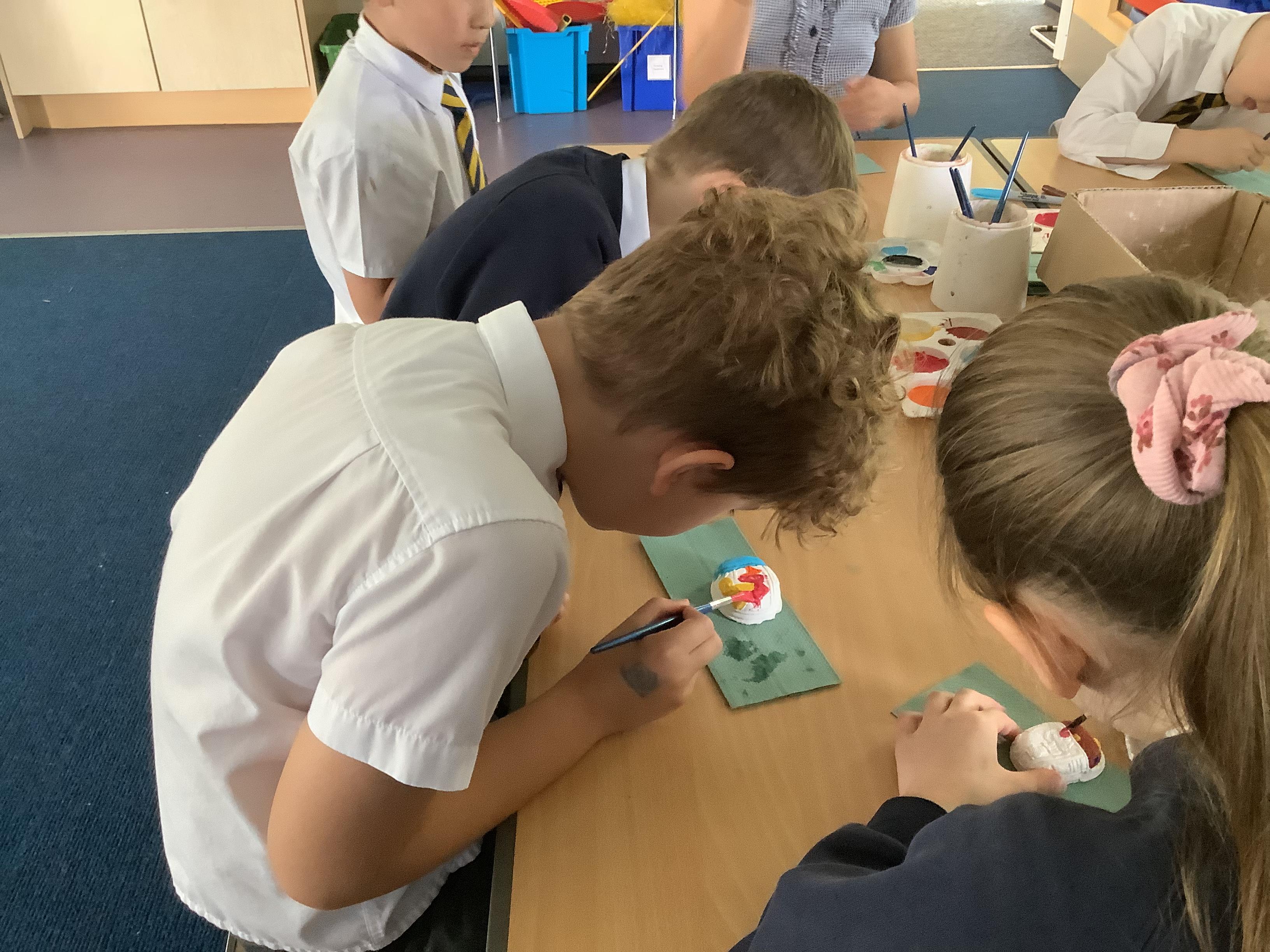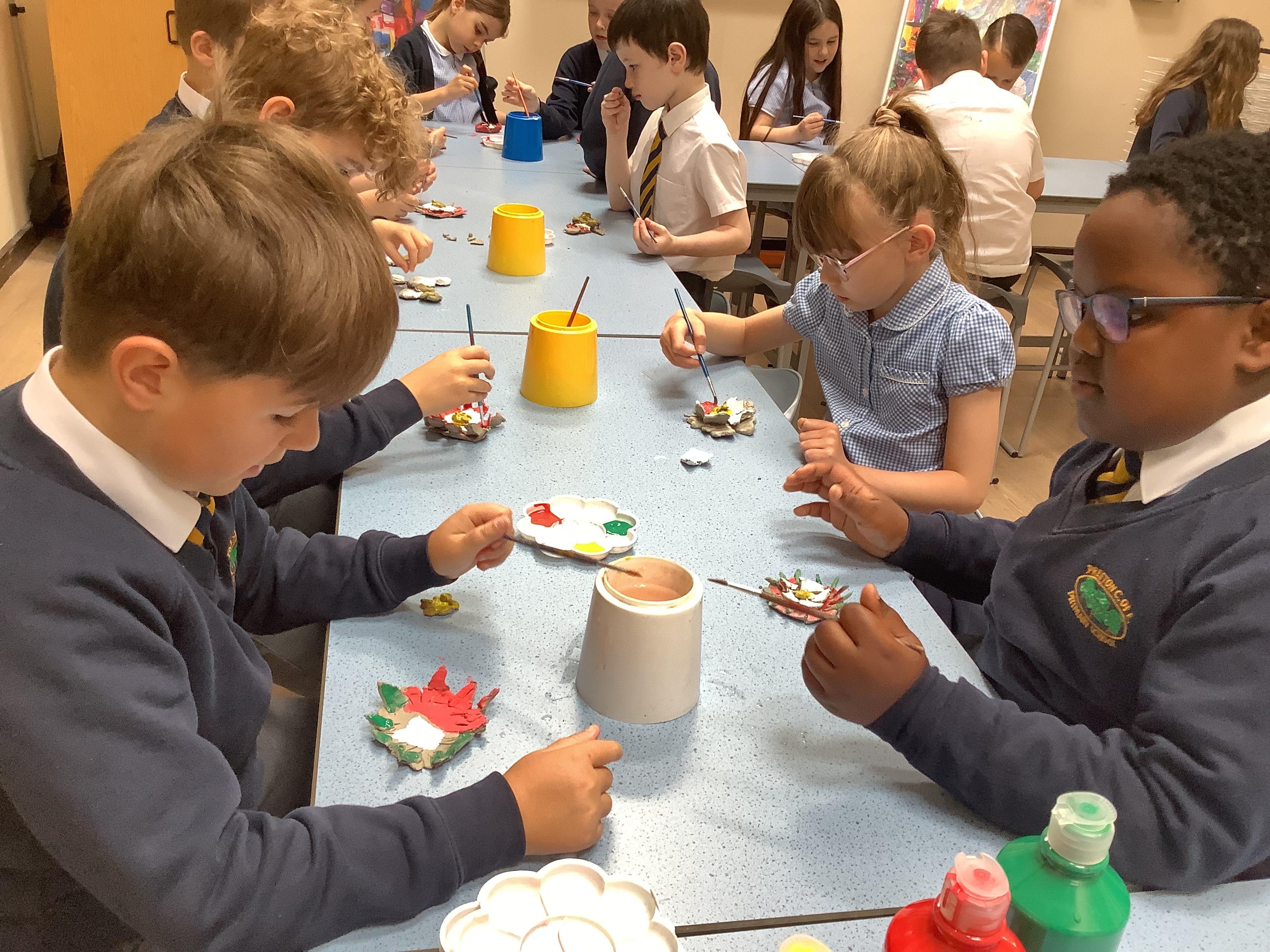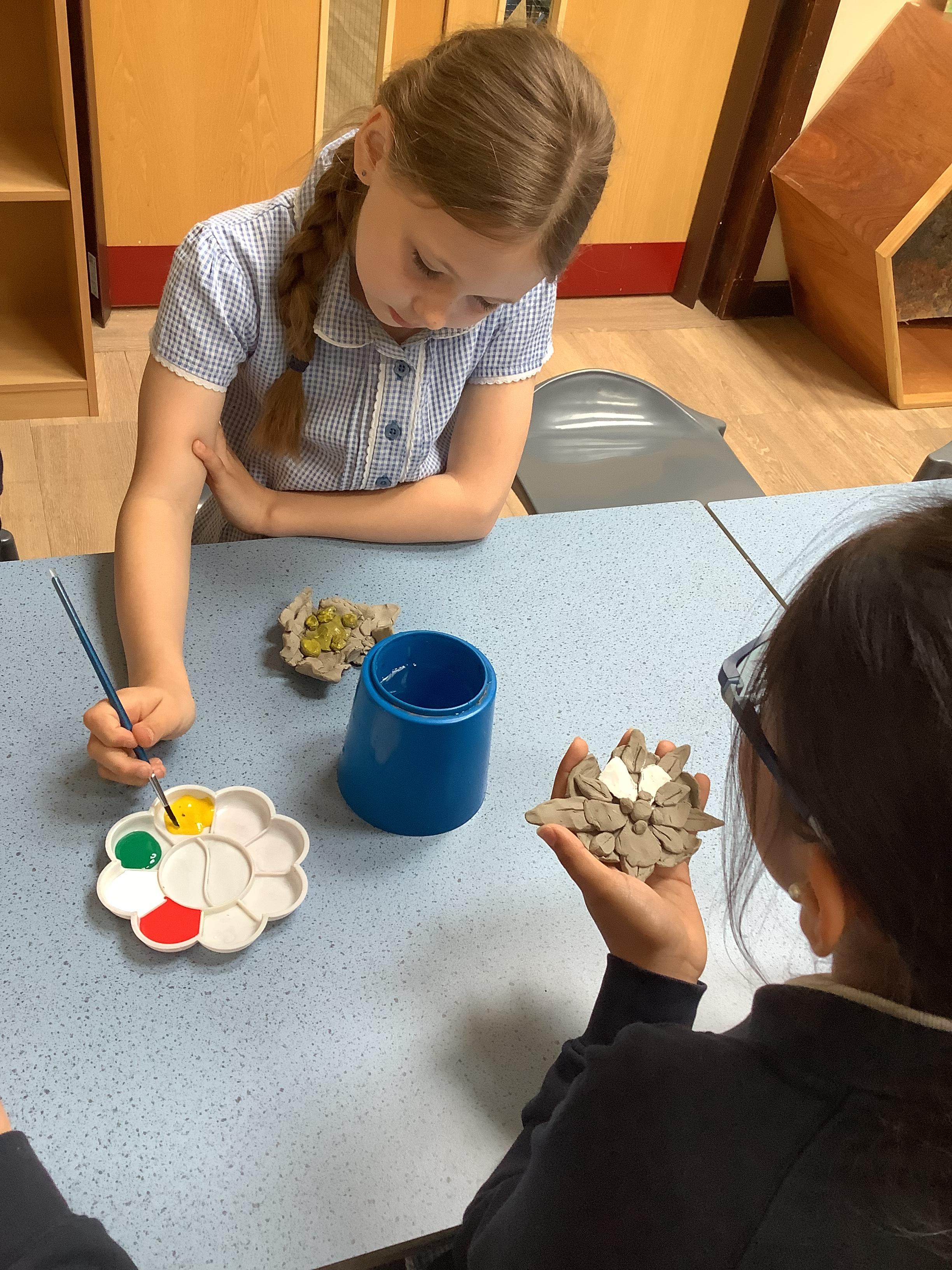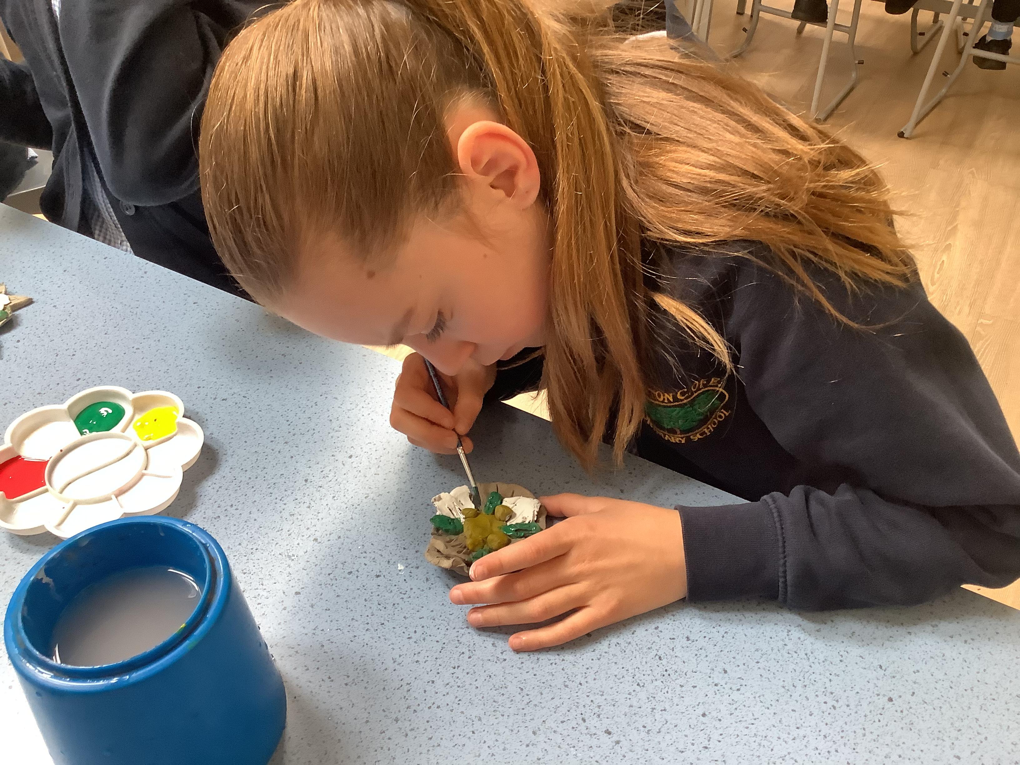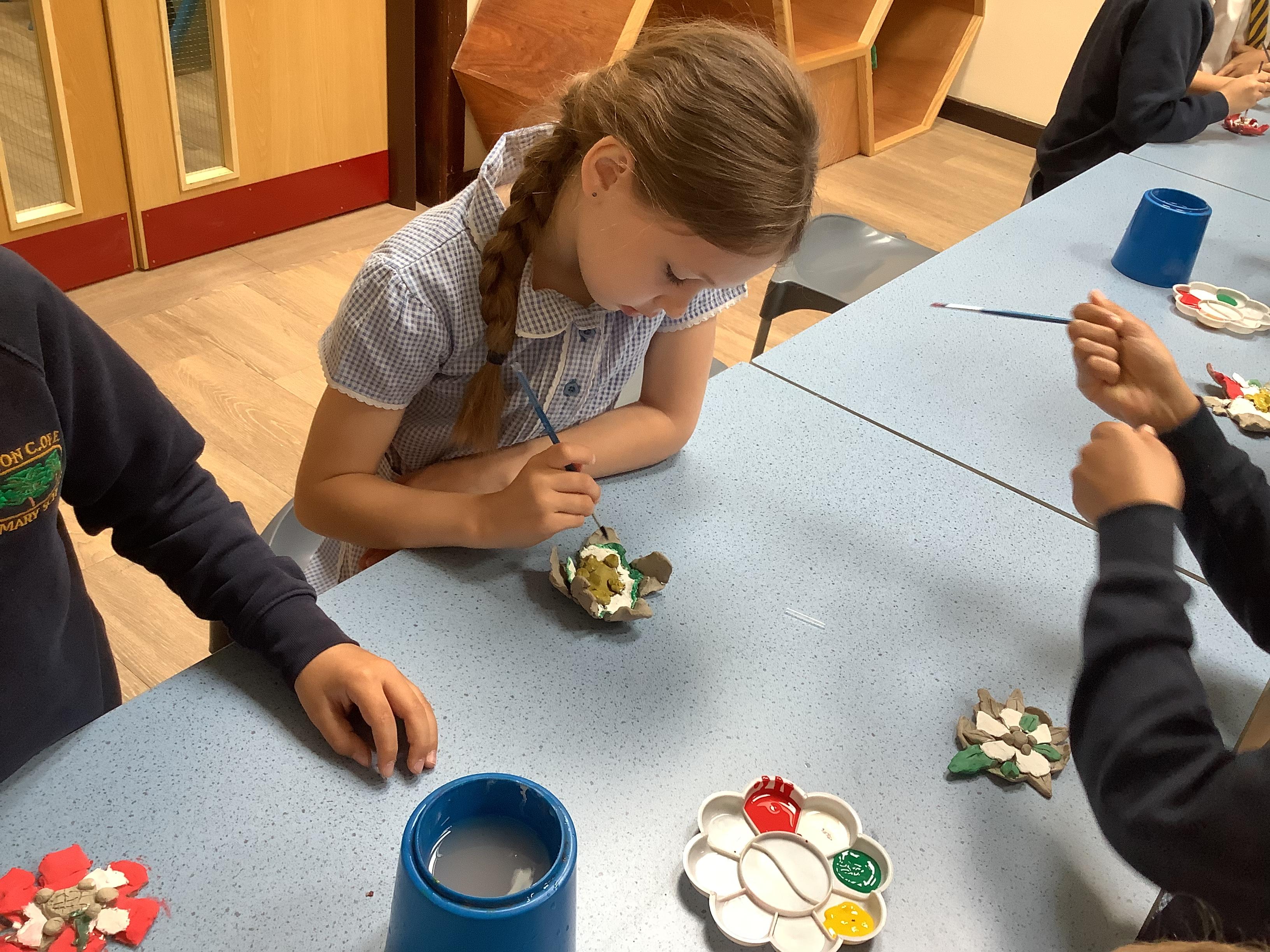 Today we painted our Tudor roses from Wednesdays Tudor day. They had finally dried so we could add the paint to them. I think you’ll agree they look amazing!