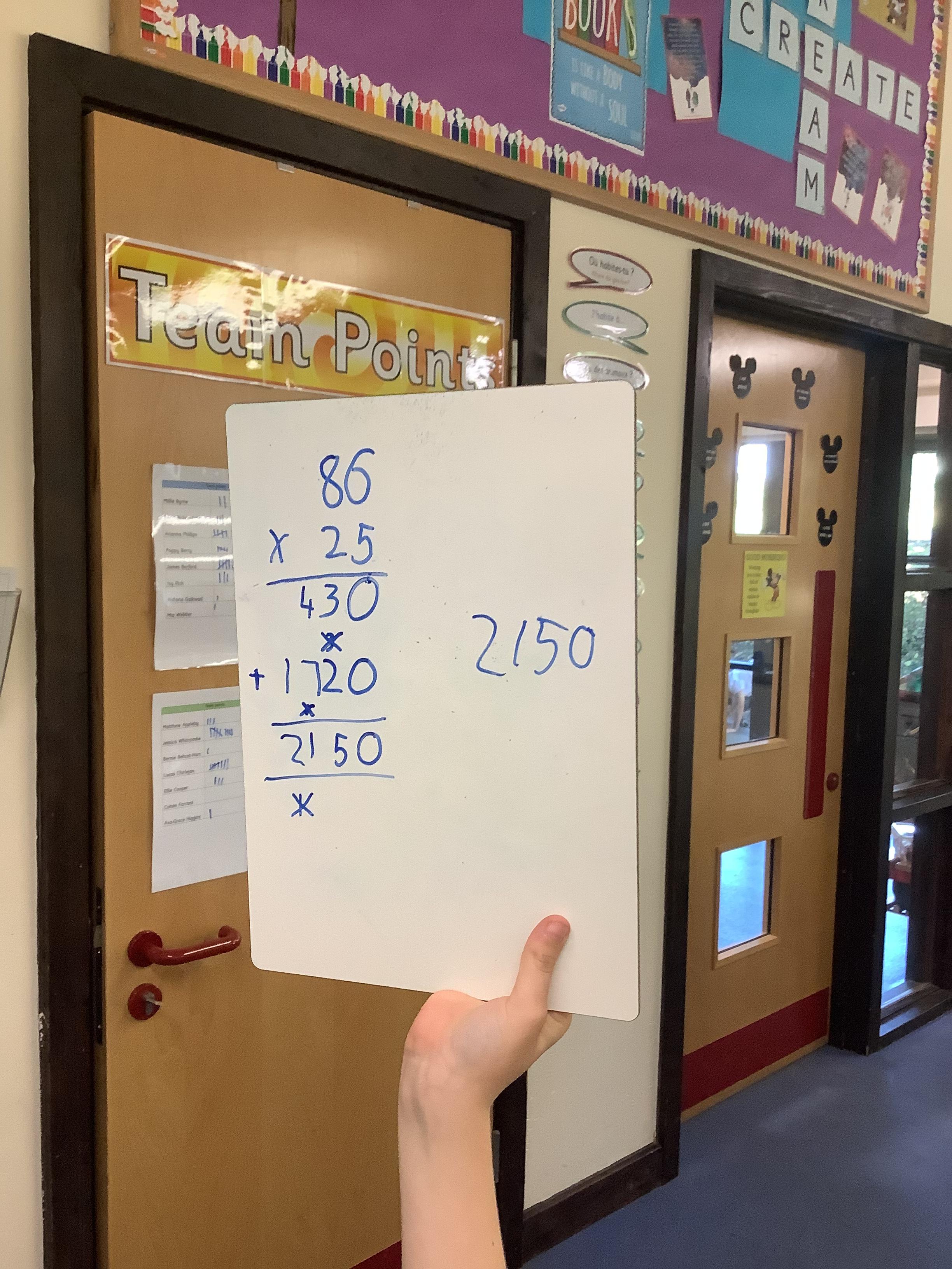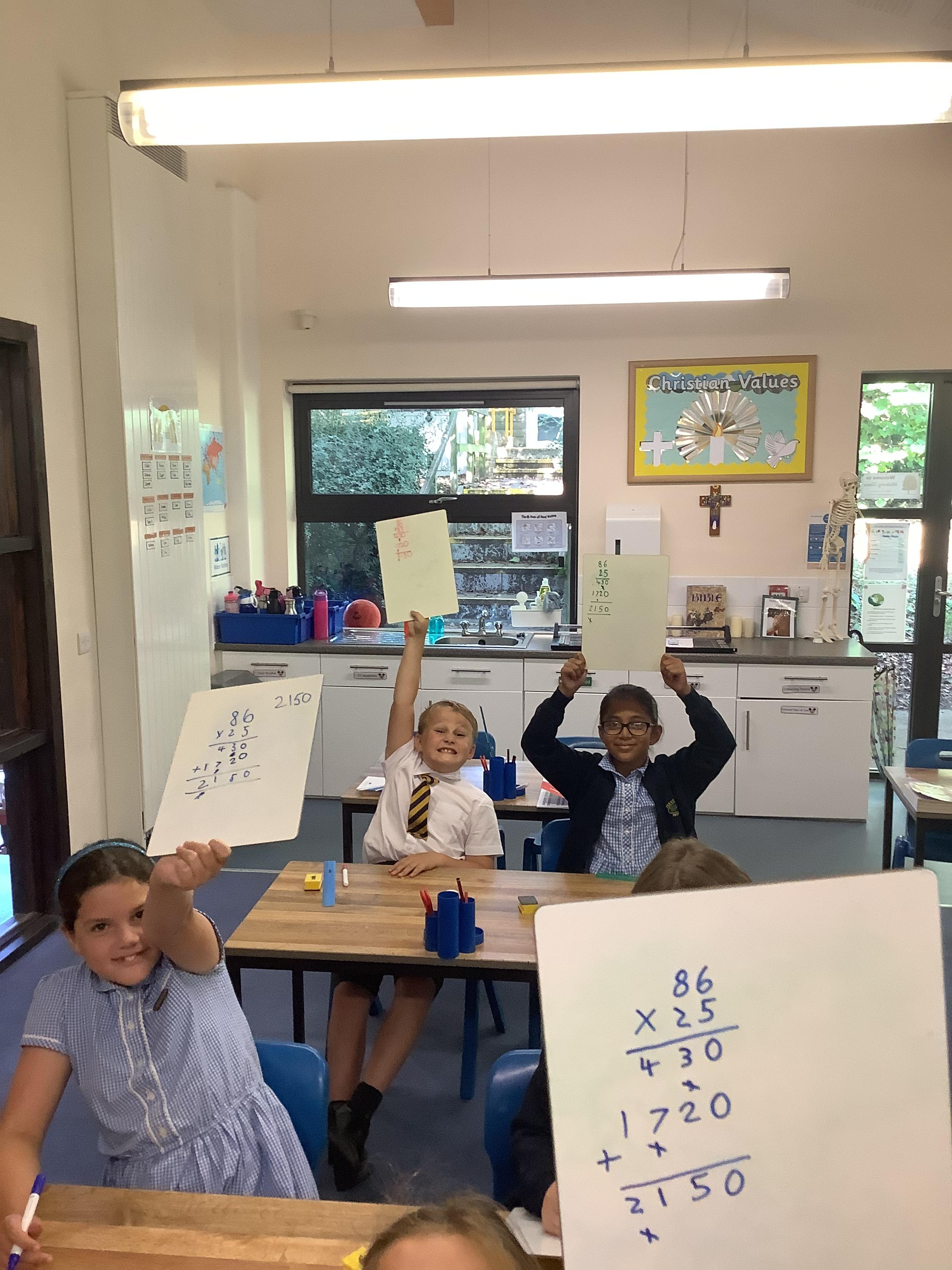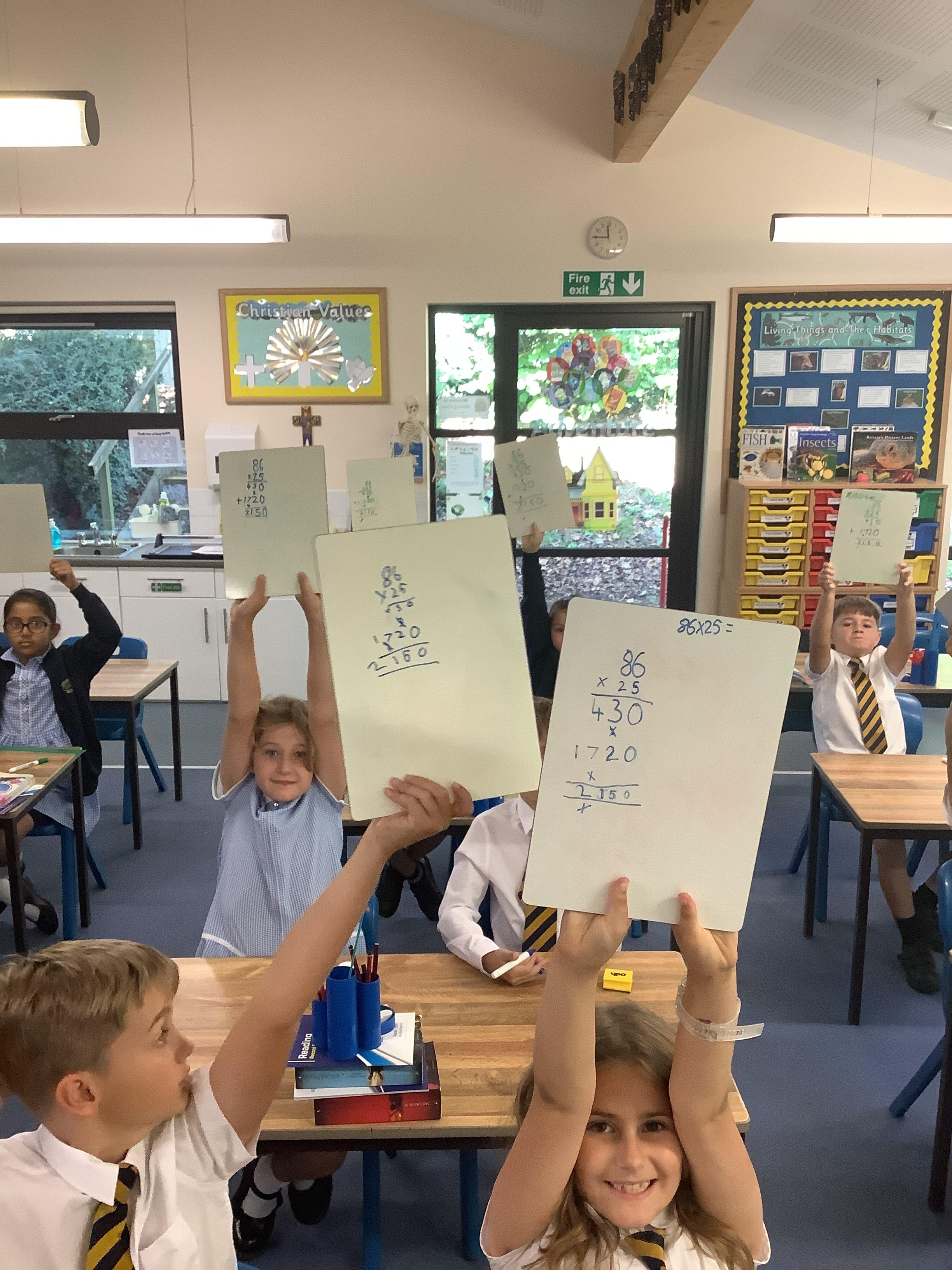 In today’s lesson we learned, for the first time, how to calculate 2 digits by 2-digit multiplication. The children did very well and practised lots on their whiteboards. Following each step, they were able to solve complicated problems.